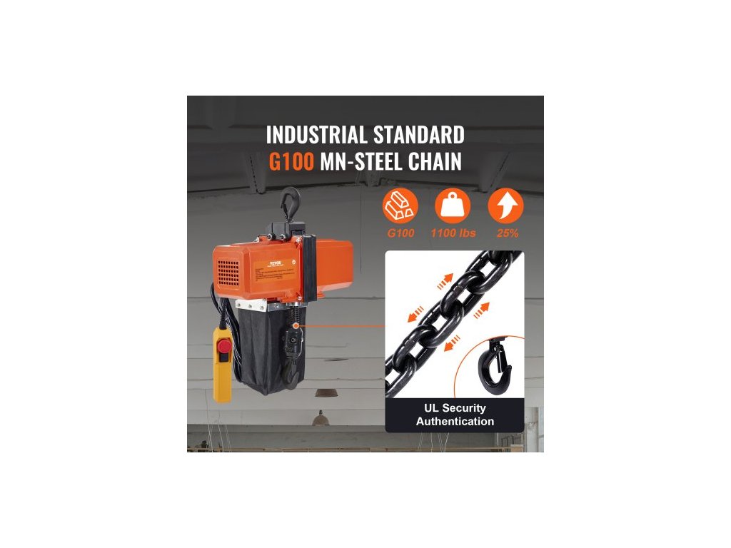 Napětí/frekvence: Jednofázové, AC230V, 50Hz,Maximální výška zdvihu: 4,5 m,Specifikace dálkového ovládání: Drátové, 3 m,Číslo modelu položky: BDH500,Hmotnost výrobku: 22,934 kg,Příkon: 580 W,Materiál řetězu:Legovaná ocel 8620 (G100),Nosnost: 499 kg,Průměr lanka řetězu: 6,3 mm,Rozměry výrobku: 15,0 x 8,2 x 20,1 palce / 380 × 208 × 510 mm