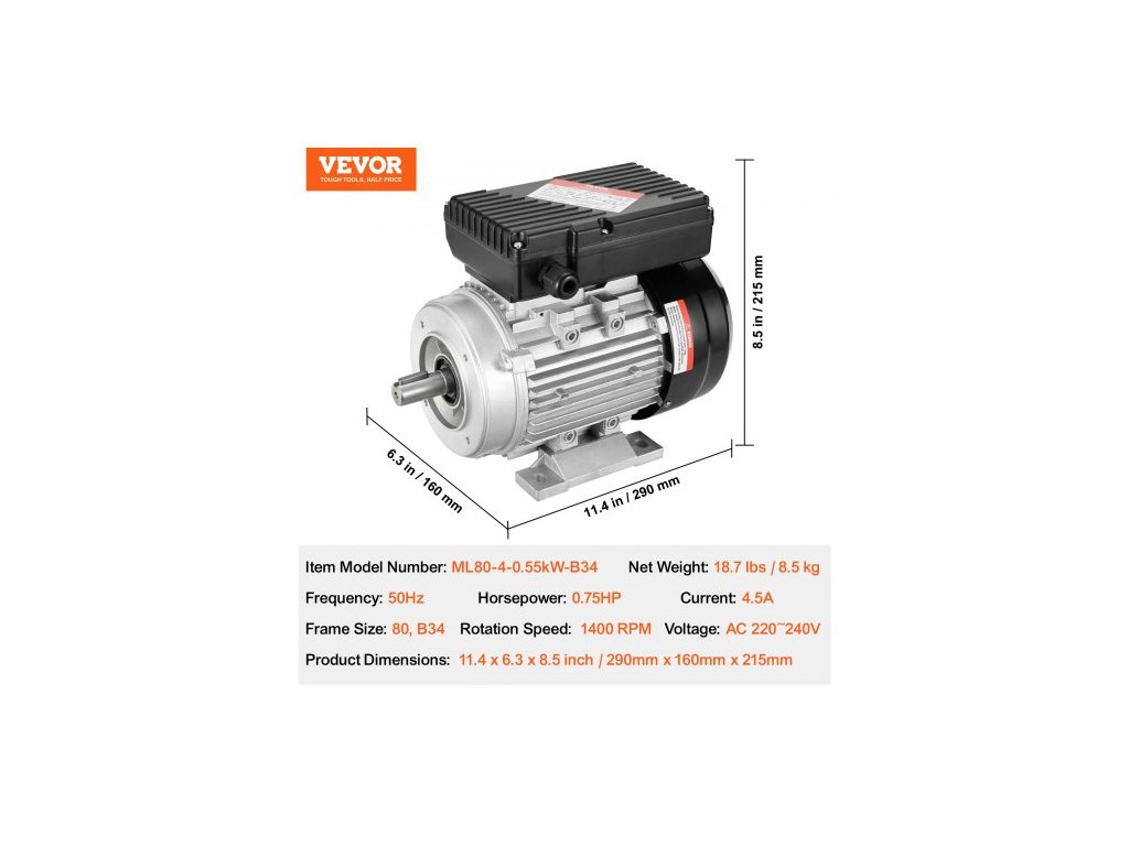 Napětí: AC 220~240V,Číslo modelu položky: ML80-4-0,55kW-B34,Frekvence: 50Hz,Rozměry výrobku: 11,4 x 6,3 x 8,5 palce / 290 x 160 x 215 mm,Proud: 4,5A,Čistá hmotnost: 18,7 lbs / 8,5 kg,Výkon: 0,55 kW / 0,75 HP,Rám Velikost: 80, B34, Rychlost otáčení: 1400 ot./min