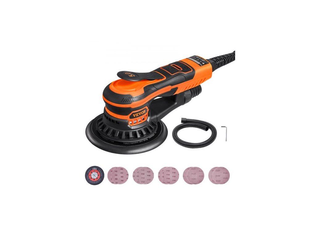 Excentrická orbitální bruska 6 palců, 350W bezkartáčová orbitální bruska, 10 000 otáček za minutu 6 elektrická bruska s nastavitelnou rychlostí a 10 ks brusných papírů, konektorem pro prach a hadicí pro detailní broušení dřeva