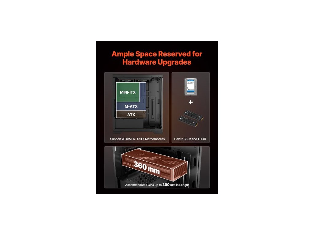 Kompatibilita se základní deskou: ATX/M-ATX/ITX,Typ: Mid Tower,Podporovaný počet ventilátorů: 4 x 120 mm ventilátory, 4 x 140 mm ventilátory,Rozšiřující sloty: 7,Maximální délka GPU: 14,17 palce / 360 mm,Číslo modelu položky: 370,Porty: 1 x Type-C, 1 x USB 3.0,Jack pro mikrofon,Audio jack,Materiál: SPCC ocel + tvrzené Sklo