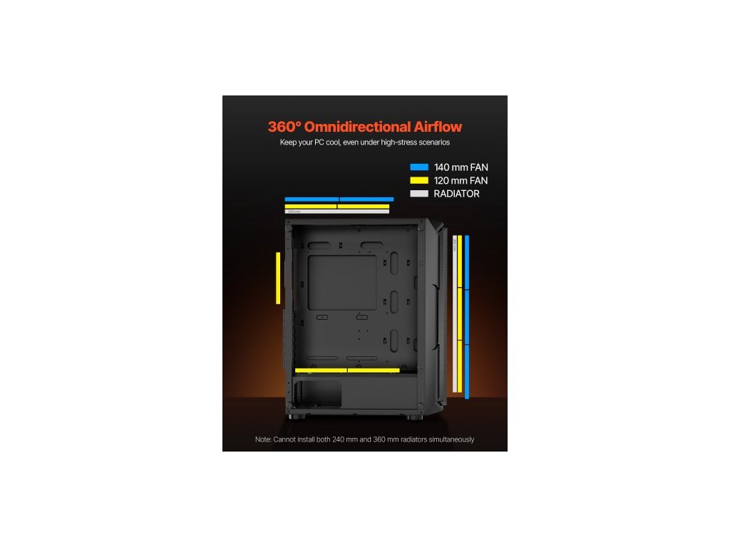 Kompatibilita se základní deskou: ATX/M-ATX/ITX,Typ: Mid-Tower,Podporovaný počet ventilátorů: 8 x 120 mm ventilátory, 5 x 140 mm ventilátory,Rozšiřující sloty: 7,Maximální délka GPU: 12,6 palce / 320 mm,Číslo modelu položky: 211I,Porty: 1 x USB 3.0, 2 x USB 2.0,Jack pro mikrofon,Audio jack,Materiál: SPCC ocel + Tvrzené sklo