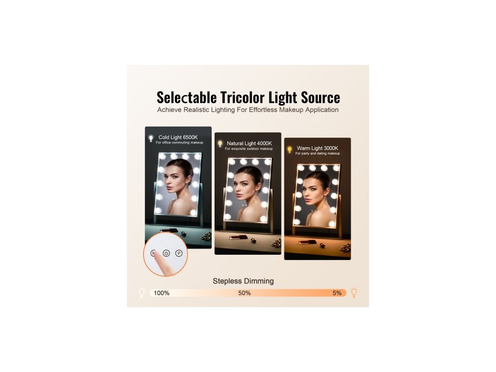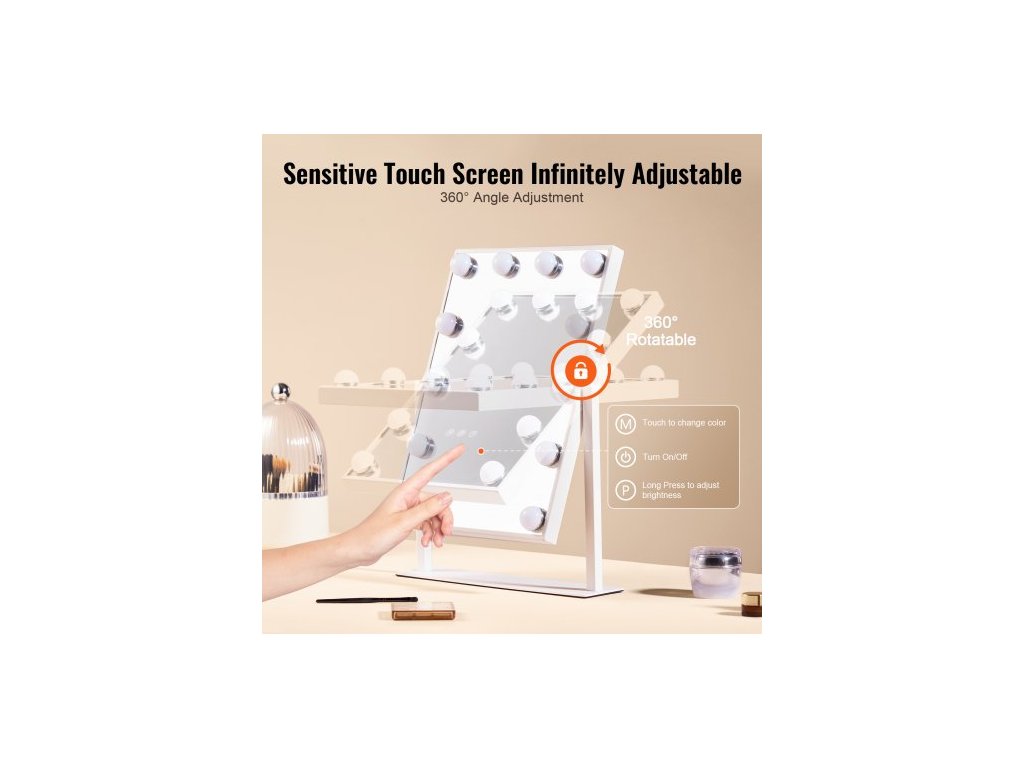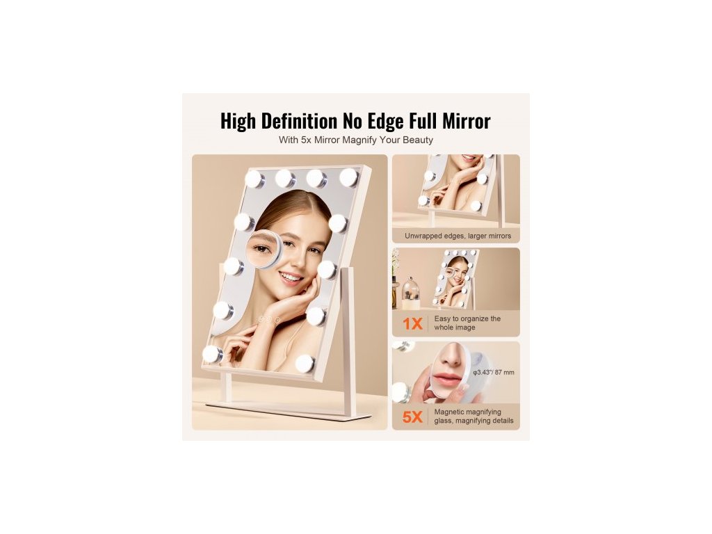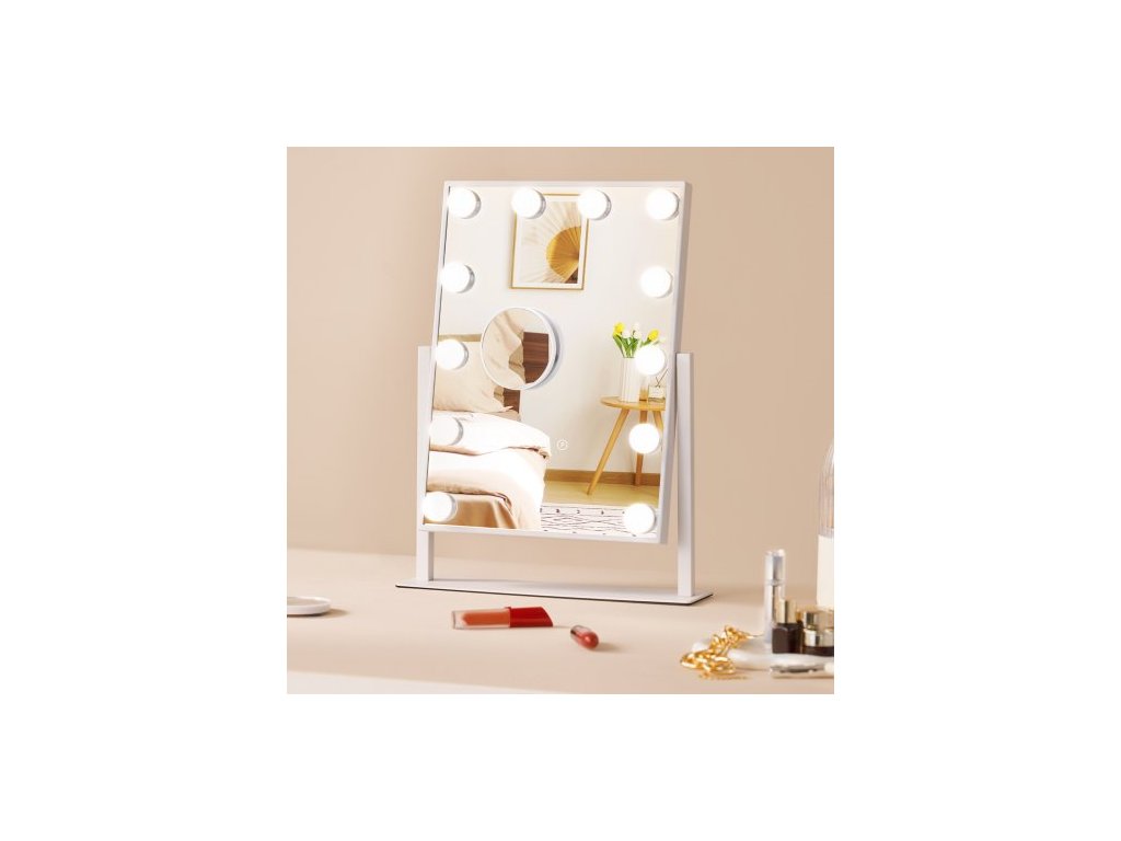 Hollywoodské kosmetické zrcátko s osvětlením, 12 stmívatelnými žárovkami a 3 barevnými režimy osvětlení, odnímatelné kosmetické zrcátko s 5násobným zvětšením, chytré dotykové ovládání, otočení o 360 stupňů (41,4 x 29,8 cm, bílé)