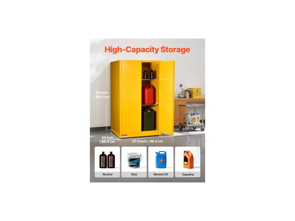 Hořlavá skříň , 96,4 x 86,4 x 165,1 cm, 65 galonů hořlavá skladovací skříň s nastavitelnou policí, protipožární skříně z válcované a pozinkované oceli, pro komerční, průmyslové a domácí použití, žlutá