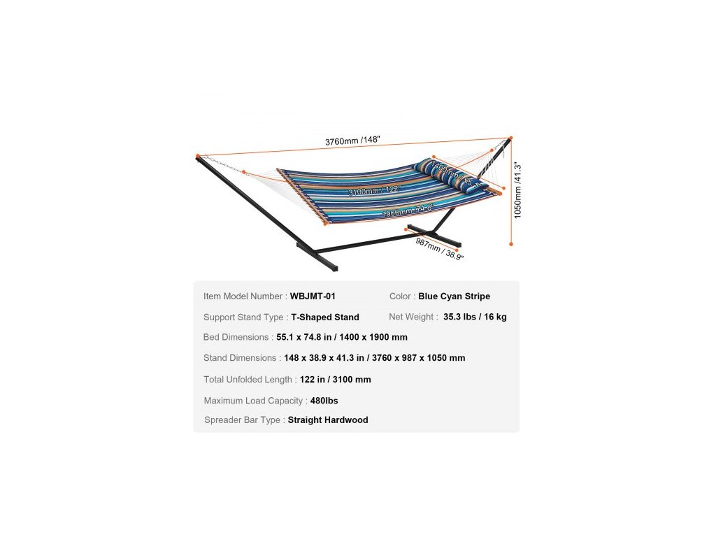 Typ stojanu: Stojan ve tvaru T,Rozměry postele: 1400 x 1900 mm,Barva produktu: Modrý azurový proužek,Číslo modelu položky: WBJMT-01,Maximální nosnost: 226 kg,Typ rozpěrné tyče: Rovné tvrdé dřevo,Rozměry stojanu: 3760 x 38,9 x 101,5 cm 987 x 1050 mm, Celková délka v rozloženém stavu: 122 palců / 3100 mm, Čistá hmotnost: 35,3 lbs / 16 kg