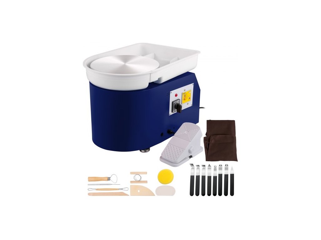 Hrnčířský kruh 27,9 cm 0-300 ot./min. Keramický kruh, tvářecí stroj s nastavitelnou rychlostí 350 W se sochařskými nástroji a zástěrou, odnímatelná pánev s ovládáním nožním pedálem pro umělecké řemeslné práce a domácí kutily, modrá
