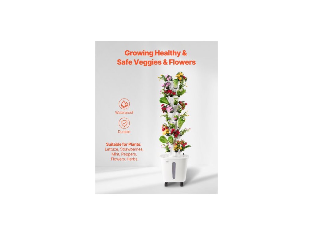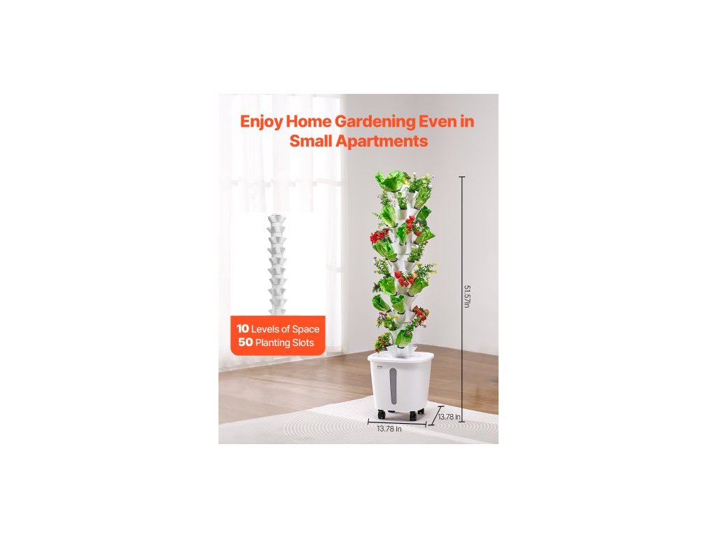Počet vrstev: 10,Hlavní materiály: ABS, PP,Včetně pěstebního světla: Ne,Objem vodní nádrže: 20 l,Kolečka: Ano,Barva: Bílá,Číslo modelu položky: VV1-10C-EU,Hmotnost výrobku: 9,48 lbs / 4,3 kg,Rozměry: 13,78 x 13,78 x 51,57 palce / 350 x 350 x 1310 mm,Počet výsadbových slotů: 50