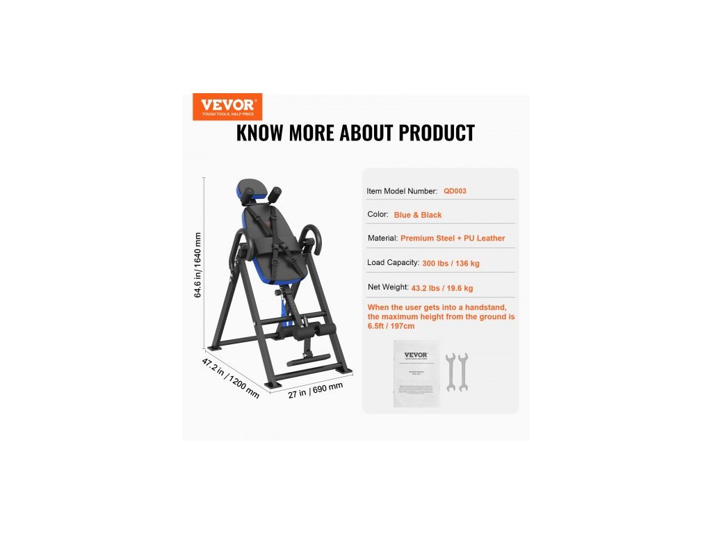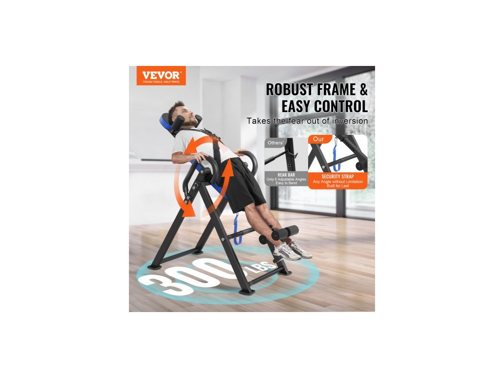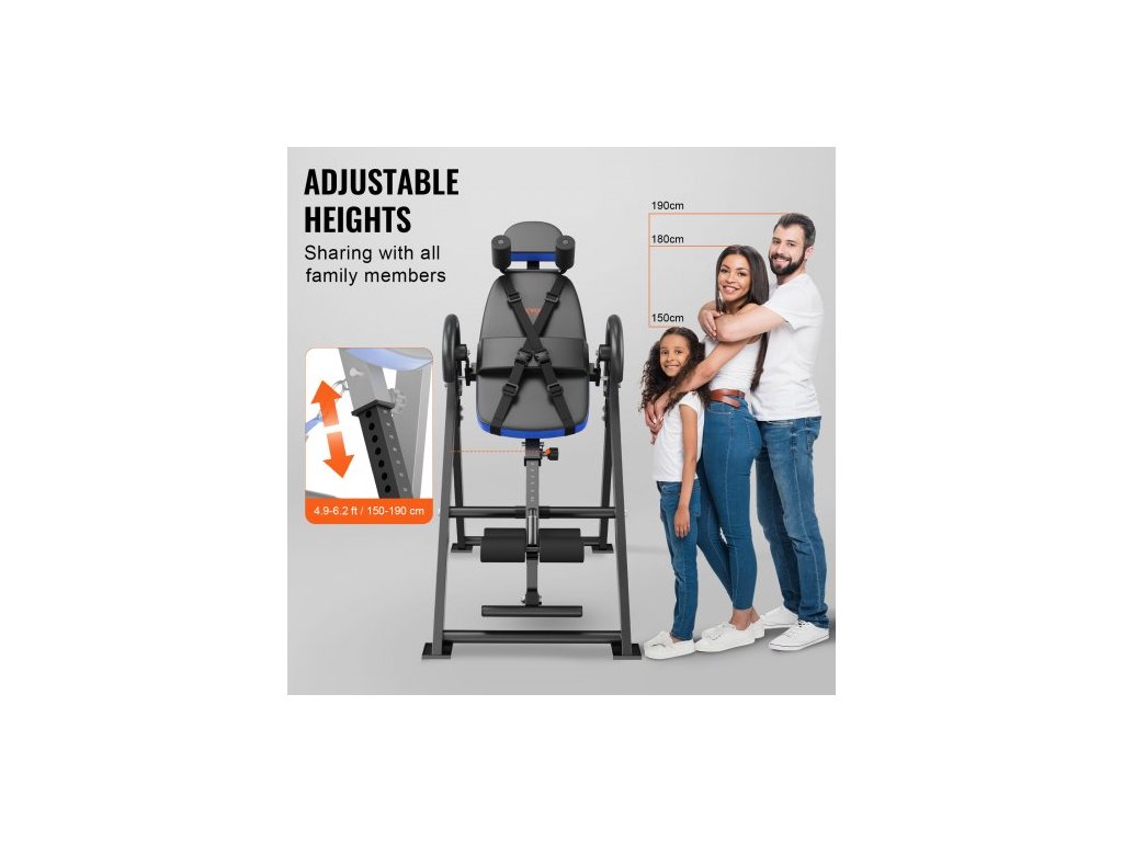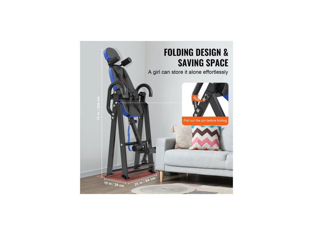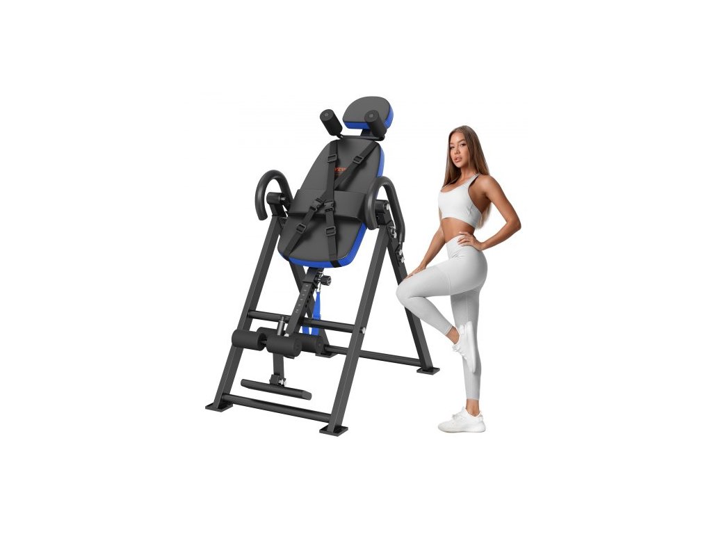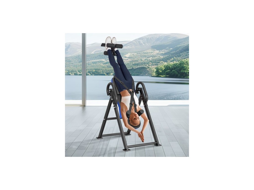 Inverzní stůl , nosnost 136 kg, vysoce odolný inverzní stůl, dekompresní zádový repetirní stroj, silový tréninkový stroj s opěrkou hlavy, aretace kotníků, nastavitelný ochranný pás, modro/černý