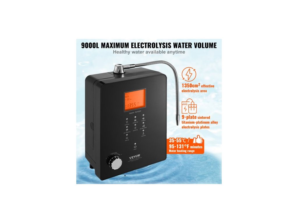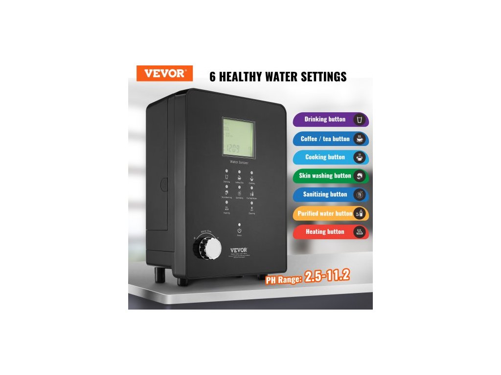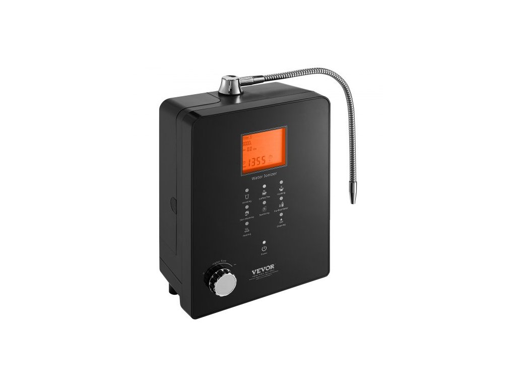 Ionizátor alkalické vody , pH 3-11,2, alkalický kyselý vodíkový čistič vody, 6 nastavení vody, domácí filtrační systém, ORP až -800mV, 9000l na filtr, UV funkce, ohřev vody