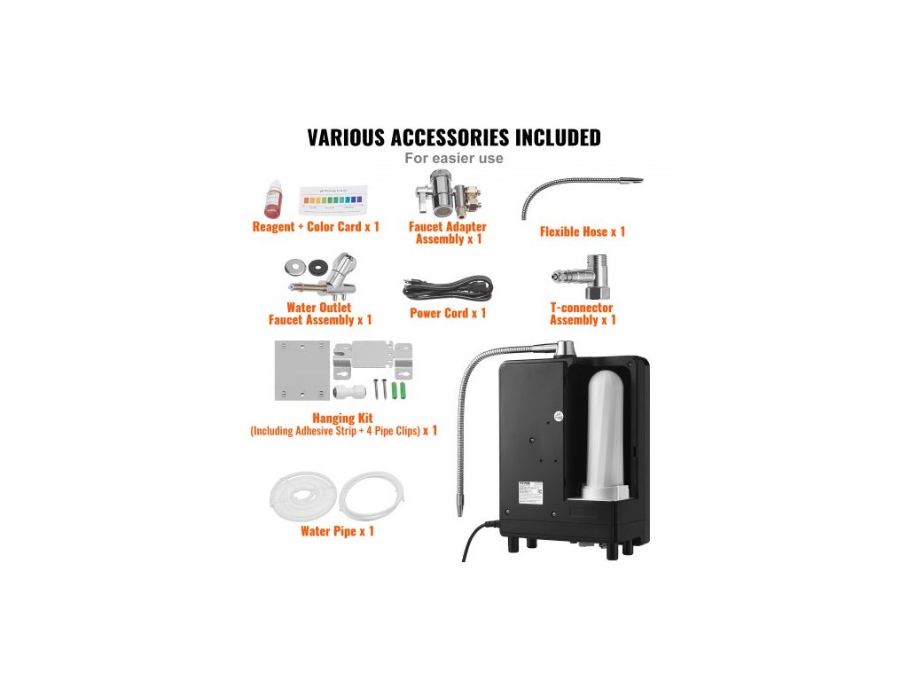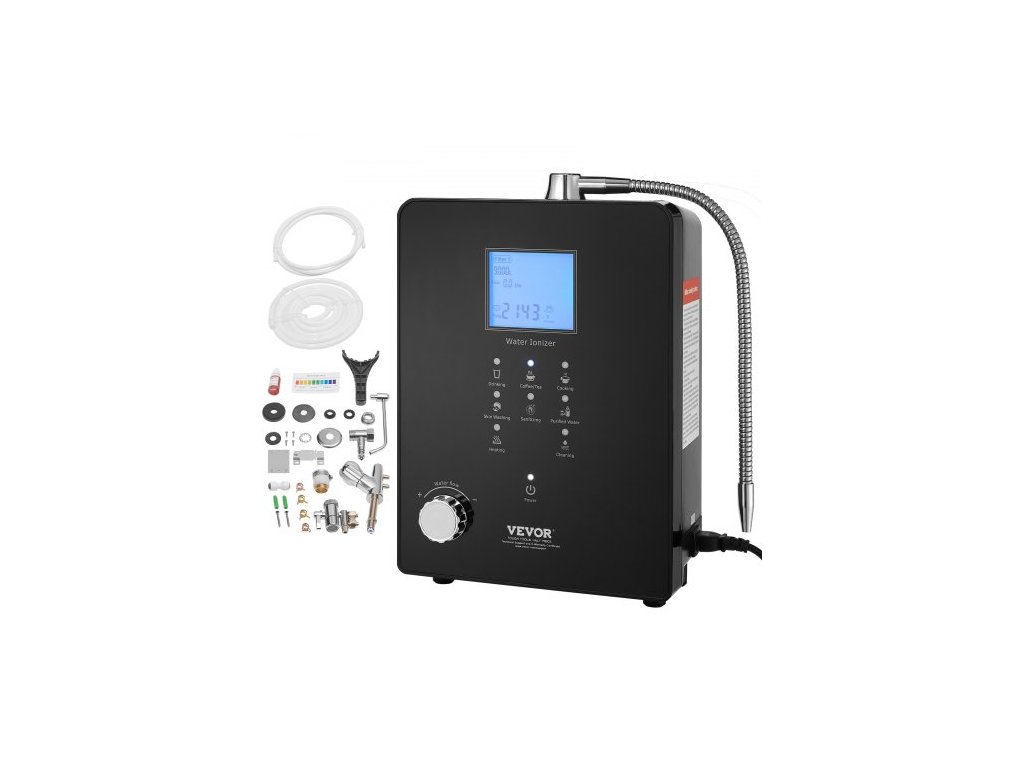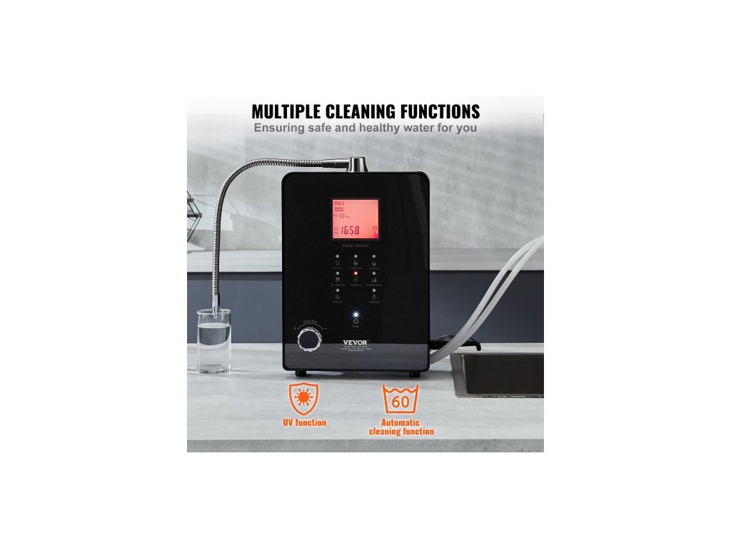 Ionizátor alkalické vody , pH 3-11,2, alkalický kyselý vodíkový čistič vody, 6 nastavení vody, domácí filtrační systém, ORP až -800mV, 9000 l na filtr, UV funkce, ohřev vody