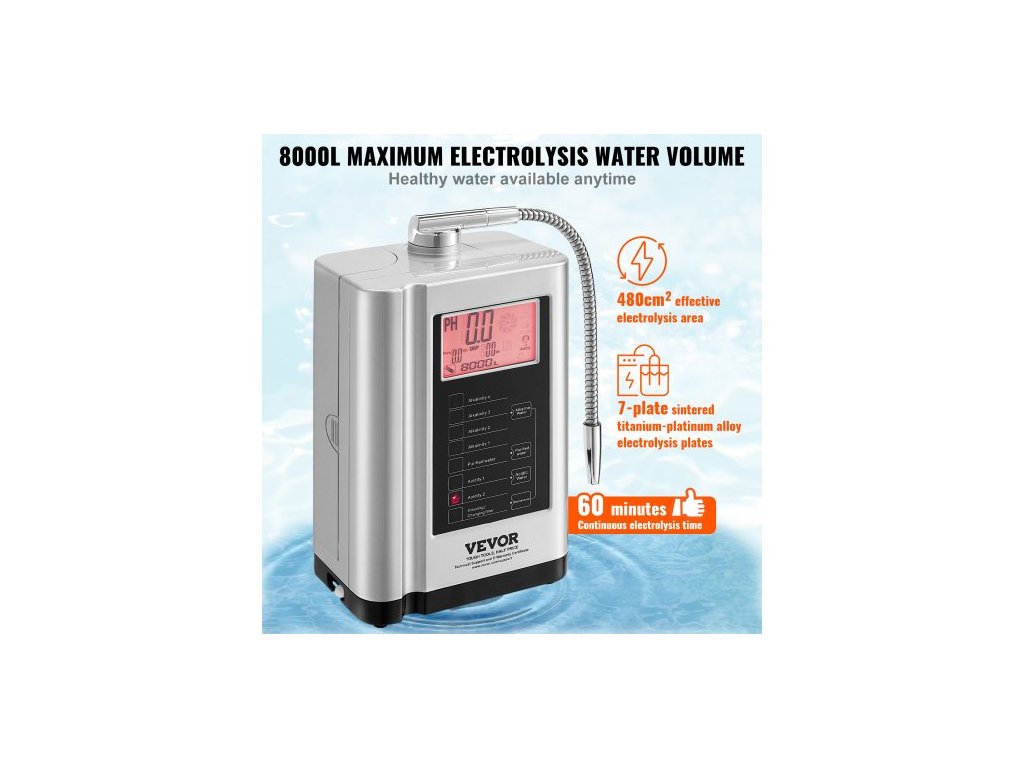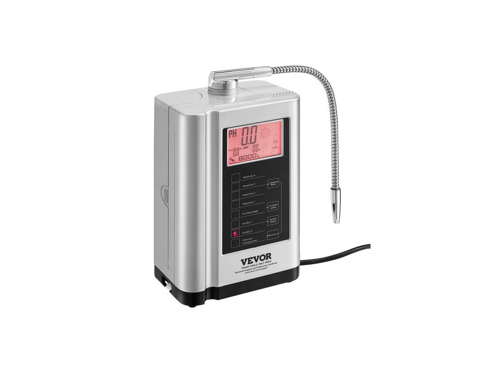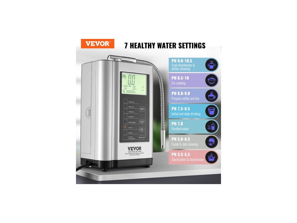 Ionizátor alkalické vody , pH 3,5-10,5, alkalický kyselý vodíkový čistič vody, 7 nastavení vody, domácí filtrační systém, ORP až -650mV, 8000 l na filtr, automatické čištění, bílá