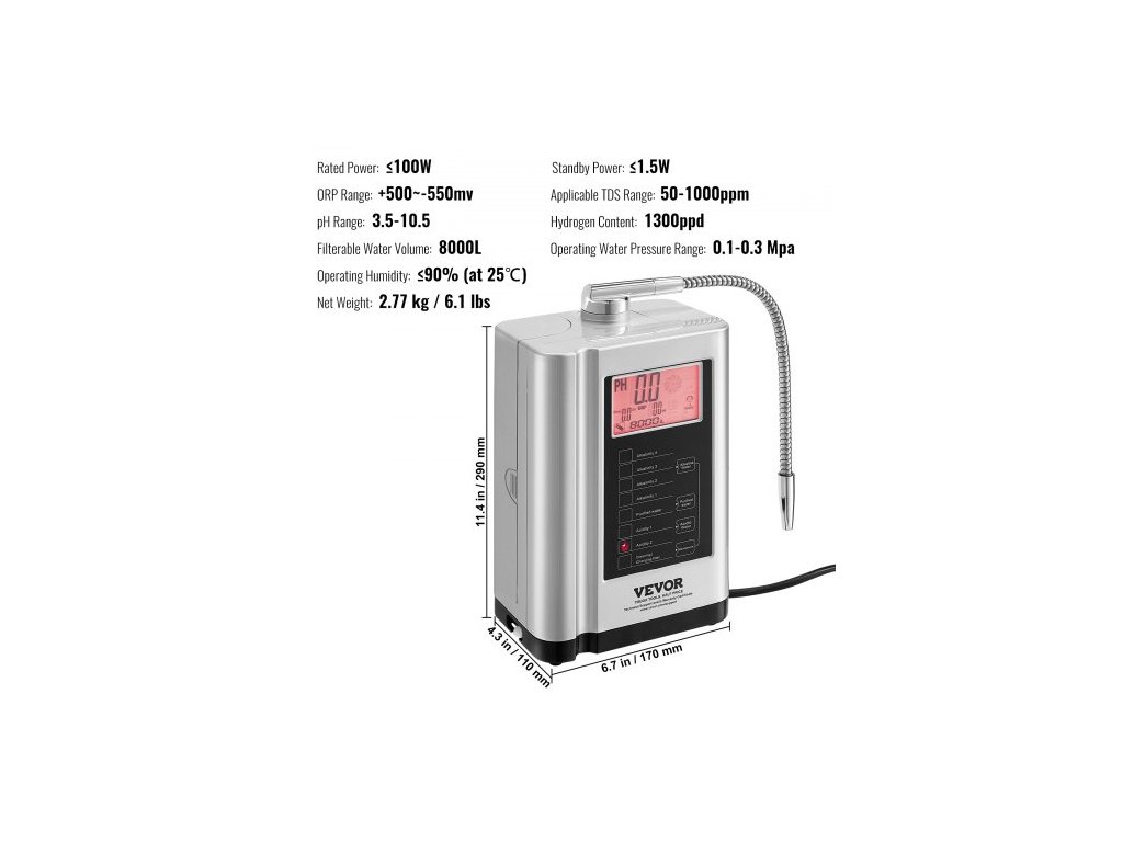 Použitelný rozsah TDS: 50-1000ppm, Obsah vodíku: 1300ppd, Provozní vlhkost: <=90% (při 25°C), Pohotovostní výkon: <=1,5W, Rozsah pH: 3,5-10,5, Rozsah ORP: +500~-650mV, Objem filtrovatelné vody: 8000l, Číslo modelu položky: EHM-729, Provozní voda Rozsah tlaku: 0,1-0,3 MPa, Čistá hmotnost: 2,77 kg / 6,1 lbs