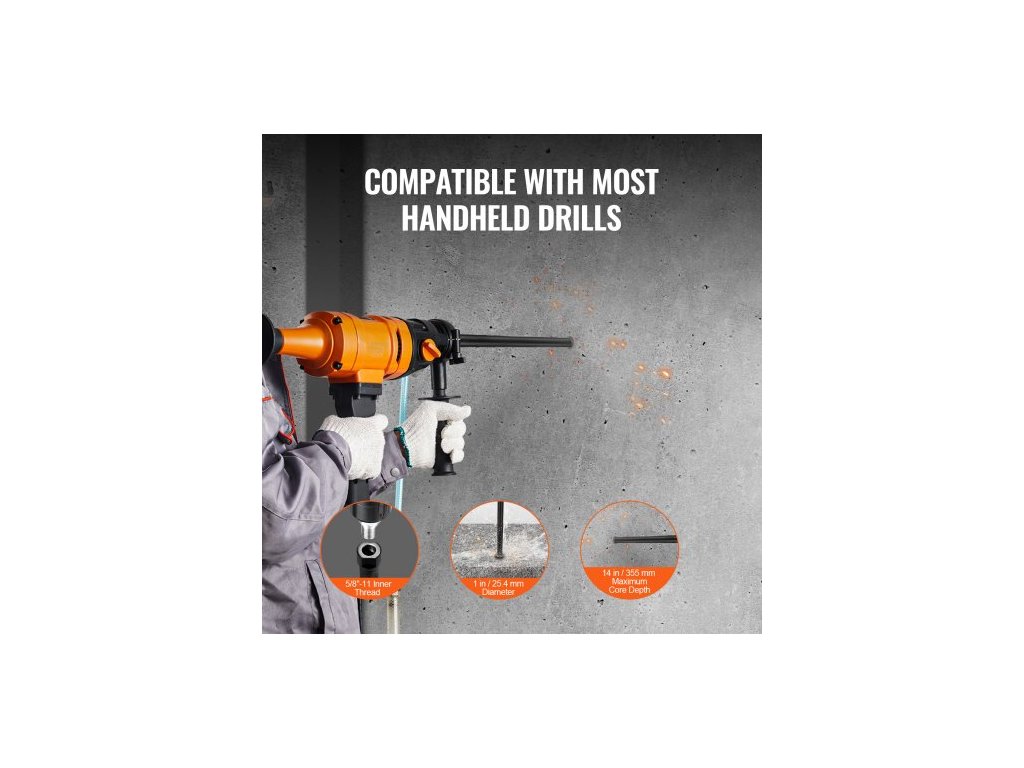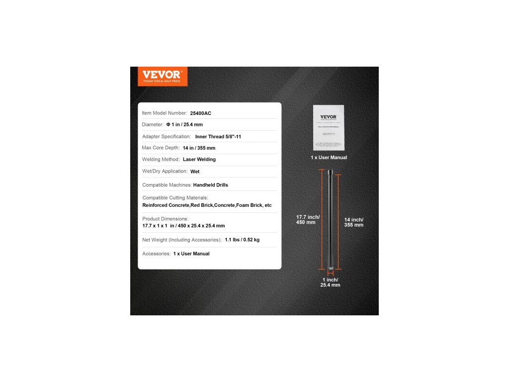 Mokré/suché použití: Mokré, Čistá hmotnost (včetně příslušenství): 1,1 lbs / 0,52 kg, Maximální hloubka vrtání: 14 in / 355 mm, Kompatibilní řezné materiály: Železobeton, červené cihly, beton, pěnové cihly atd., Číslo modelu položky: 25400AC, Kompatibilní stroje: Ruční vrtačky, Rozměry produktu: 17,7 x 1 x 1 in / 450 x 25,4 x 25,4 mm, Průměr: ? 1 palec / 25,4 mm, Specifikace adaptéru: Vnitřní závit 5/8"-11, Metoda svařování: Laserové svařování