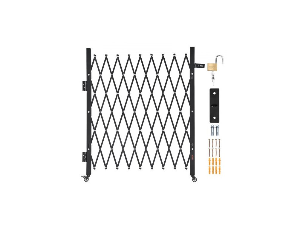 Jednoduchá skládací bezpečnostní brána, uzamykatelná nůžková brána s otočnými kolečky o 360°, venkovní ocelová zatahovací brána s barikádou, pro zabezpečení vstupu, garáže, skladu a bazénu, 190 × 131 cm (Š × V)