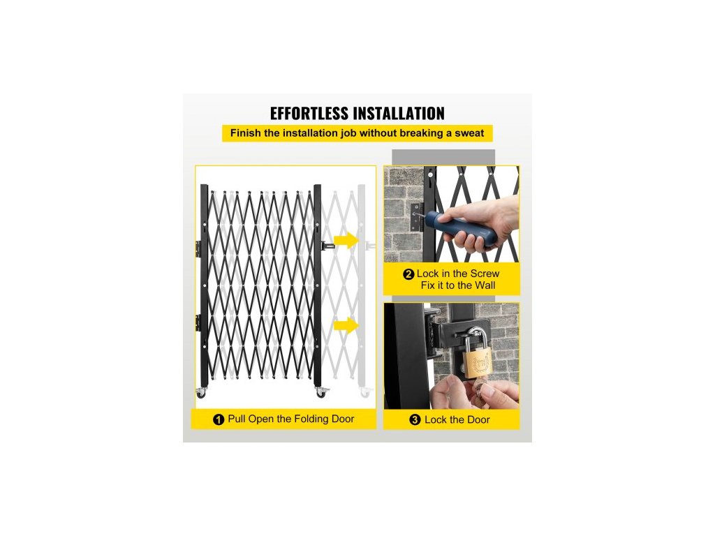 Jednoduchá skládací bezpečnostní brána , skládací brána 131,00 x 187,96 cm, ocelová harmoniková bezpečnostní brána, flexibilní rozšiřující se bezpečnostní brána, 360° rolovací barikádová brána, nůžková brána nebo dveře s visacím zámkem