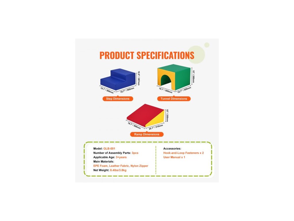 Vhodné pro děti od 3 let, Hlavní materiály: Perleťová bavlna, Kožená tkanina, Nylonový zip, Počet montážních dílů: 3 díly, Rozměry rampy: 20,1x19,7x10''/510x500x255 mm, Rozměry schodu: 19,7x19,7x10,5x5,1''/500x500x267x130 mm, Model: GLB-001, Rozměry tunelu: 19,7x19,7x15''/500x500x380 mm, Čistá hmotnost: 8,4 lbs/3,8 kg
