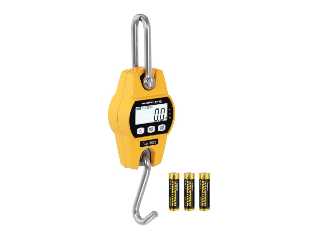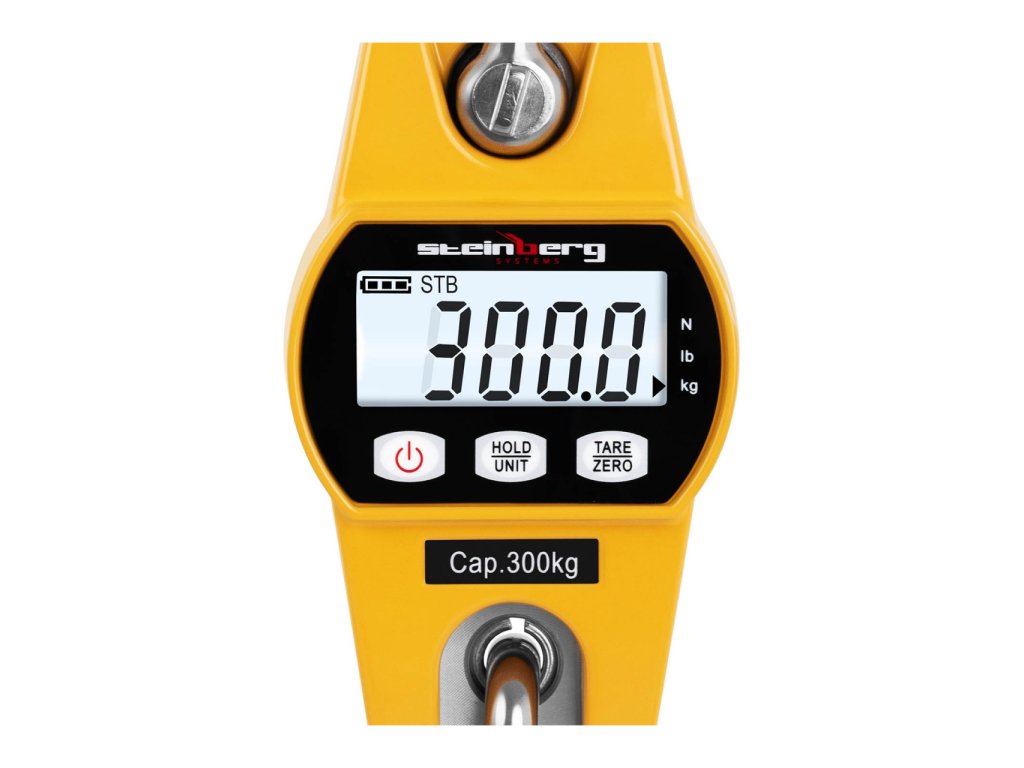Ruční jeřábová váha do 300 kgS jeřábovou váhou SBS-KW-300AG vám Steinberg Systems nabízí snadno použitelné zařízení pro určování zatížení zvedacích nástrojů s maximálním zatížením do 300 kg s přesností na 100 g. Váhy tohoto typu se také používají jako takzvané zvedací váhy. V kombinaci se zvedacími pomůckami slouží jako osobní váhy pro zdravotně postižené v domovech důchodců a nemocnicích nebo pro ambulantní péči. V sortimentu výrobce Steinberg Systems naleznete kvalitní průmyslové zboží a přesně vážicí váhy pro všechny účely.Přesná závěsná váha se zesíleným siloměremJeřábová váha značky Steinberg Systems vám poskytují řadu užitečných funkcí, jako například: podržení, tárování a nulování. Závěsná váha zobrazuje hmotnost v kilogramech (kg), librách (lb) a newtonech (N), přičemž přepínací tlačítka umožňují rychlé přepínání mezi jednotkami. Přesný výsledek se zobrazí již po 10 s, minimální hmotnost jsou 2 kg. K ochraně jeřábové váhy zařízení disponuje funkci přetížení, která vás okamžitě upozorní na překročení rozsahu vážení.Pro snadnou čitelnost je vybavena LCD displejem . Displej má podsvícení , což umožňuje snadno odečítat naměřené hodnoty z velké vzdálenosti a za špatných světelných podmínek. Režim spánku a automatické vypnutí displeje jsou zvláště úsporné a umožňují, aby použité baterie vydržely až 150 hodin.Jeřábová váha je vybavena extrémně pevným a kompaktním siloměrem o tloušťce 8 mm. Takto zaručená vyšší stabilita zajišťuje ještě přesnější a reprodukovatelnější výsledky měření než u jiných jeřábových vah. Váha bezpečně unese až 120 % maximální hmotnosti, mez pevnosti je 300 %.Vysoce kvalitní materiály a prvotřídní zpracování zaručují vysokou úroveň spolehlivosti a dlouhou životnost jeřábové váhy. Stabilní pouzdro z tlakově litého hliníku chrání měřicí zařízení před vnějšími vlivy a vibracemi. Hák a třmen z ušlechtilé oceli jsou obzvláště odolné a vhodné pro každodenní použití.