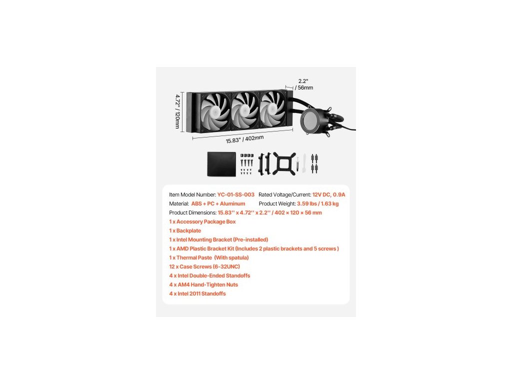 Jmenovité napětí/proud: 12V DC, 0,9A,Číslo modelu položky: YC-01-SS-003,Hmotnost výrobku: 3,59 lbs / 1,63 kg,Materiál: ABS + PC + hliník,Rozměry výrobku: 15,83'' x 4,72'' x 2,2'' / 402 x 120 x 56 mm