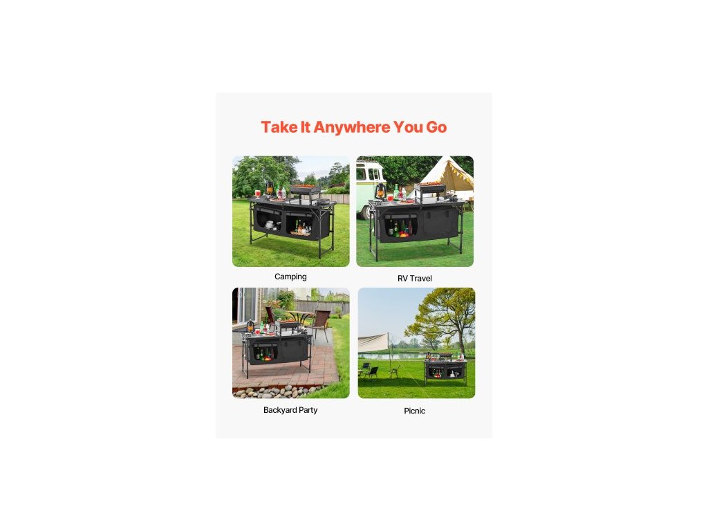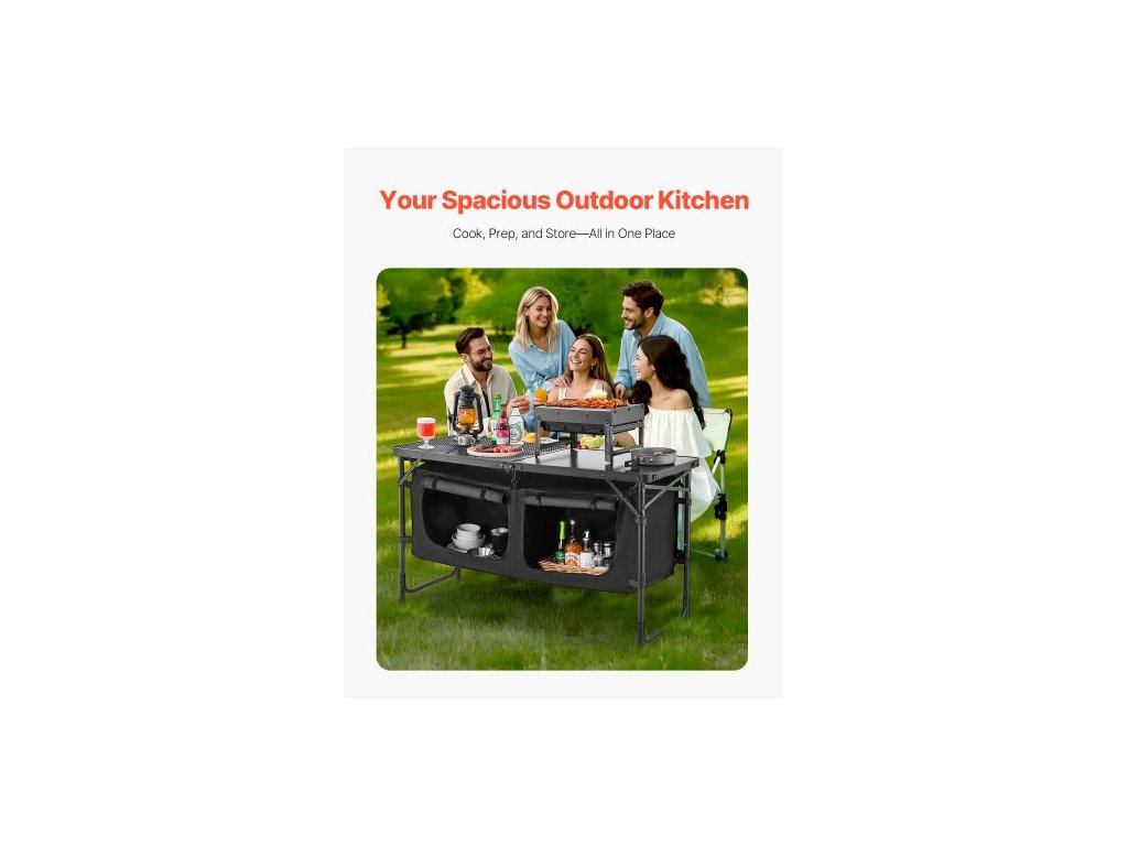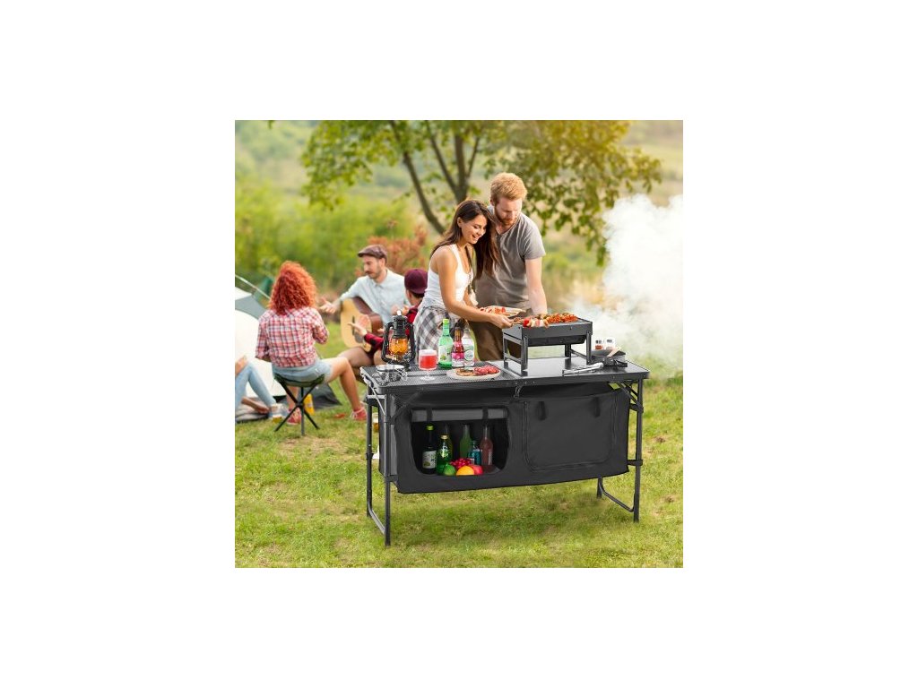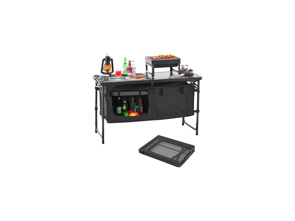kempingový kuchyňský stůl, skládací venkovní kuchyňský stůl, 3 nastavitelné výšky, hliníkový lehký přenosný kuchyňský stůl s úložným prostorem, rukojeť pro přenášení, pro grilování, piknik, cestování v karavanu, černý