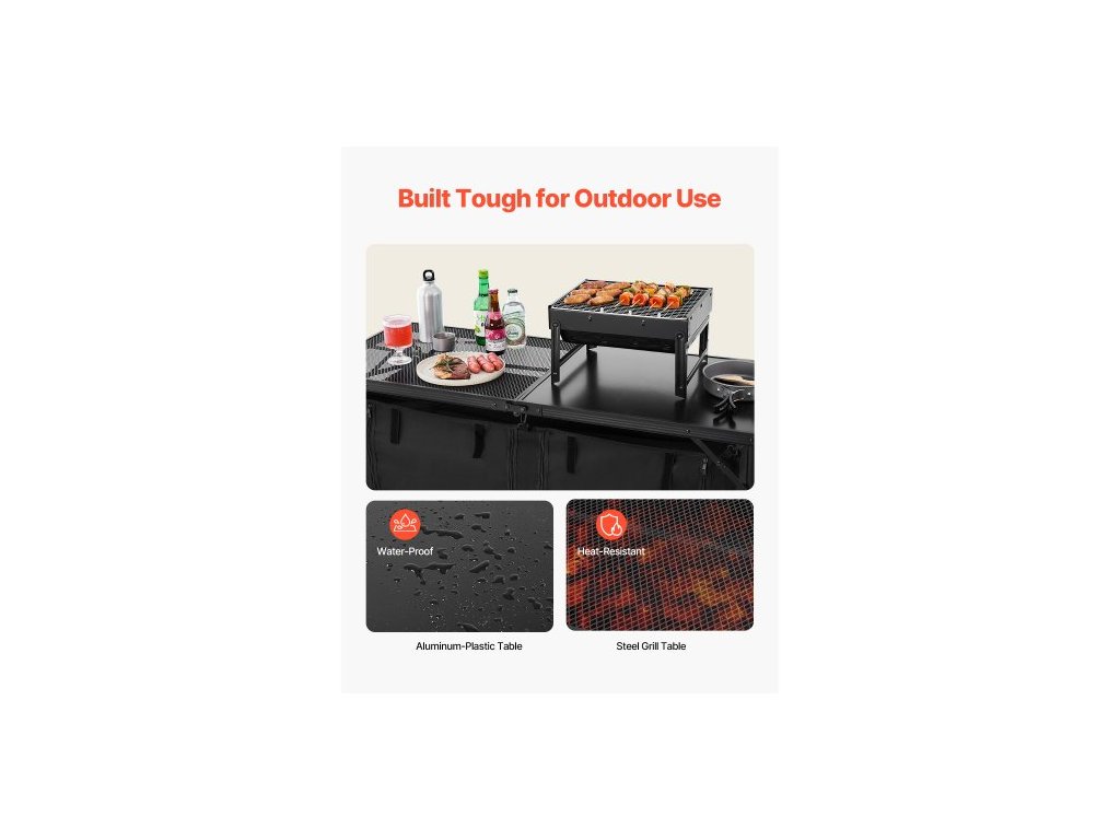 Kempovací kuchyňský stůl, skládací venkovní kuchyňský stůl, 3 nastavitelné výšky, lehký hliníkový přenosný kuchyňský stůl s úložným organizérem, rukojeť pro přenášení, pro grilování, piknik, cestování v karavanu, černý
