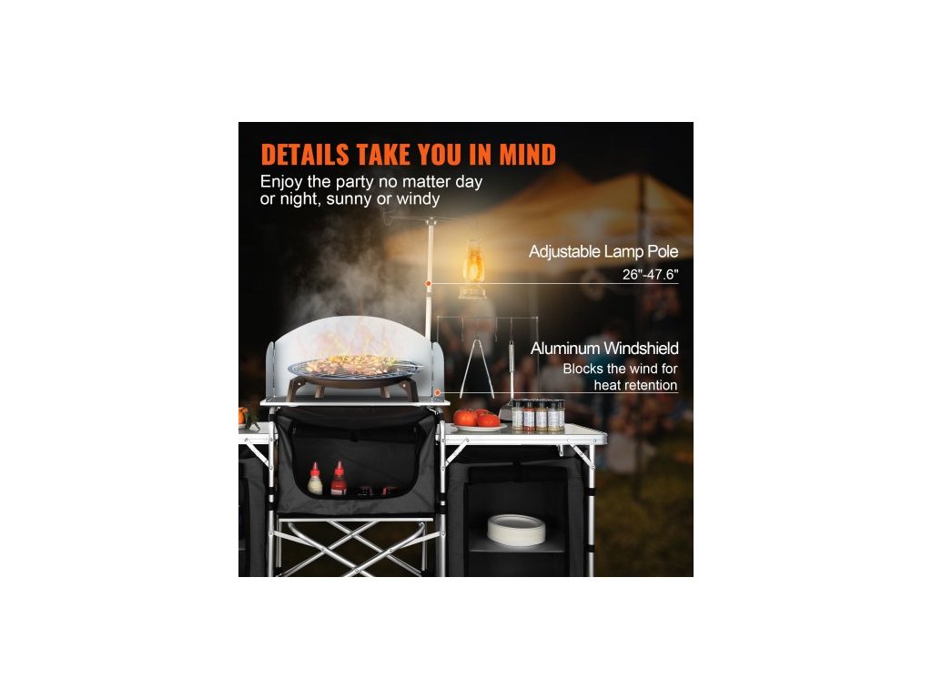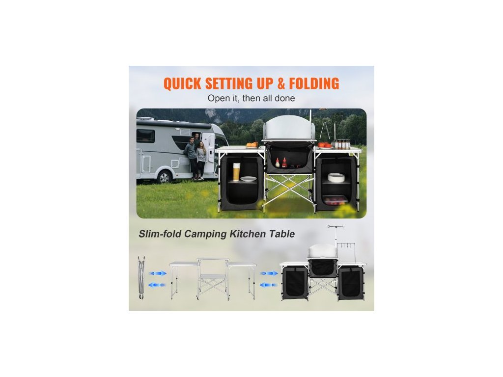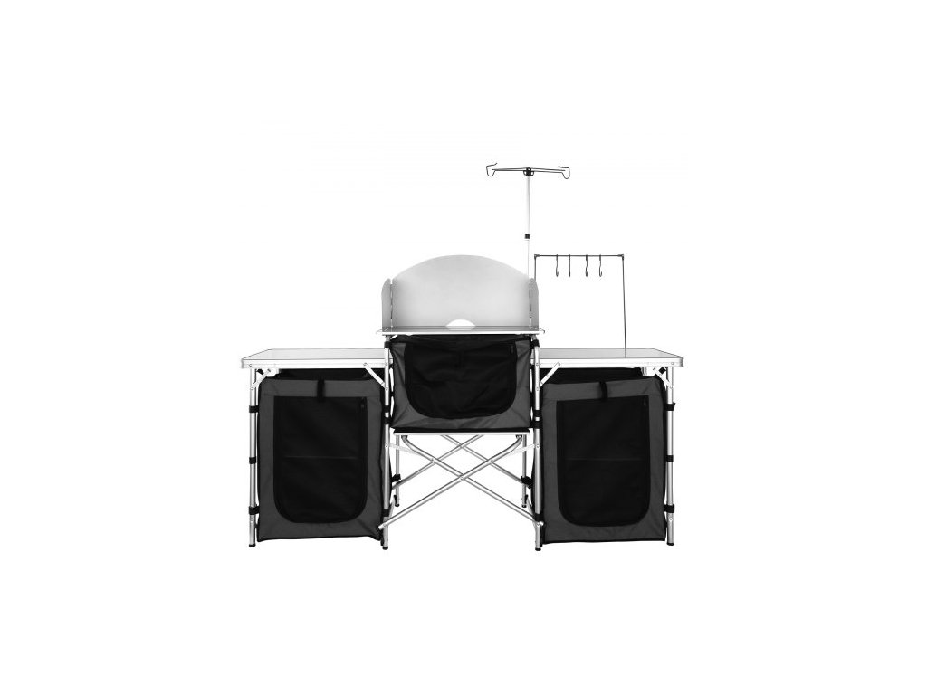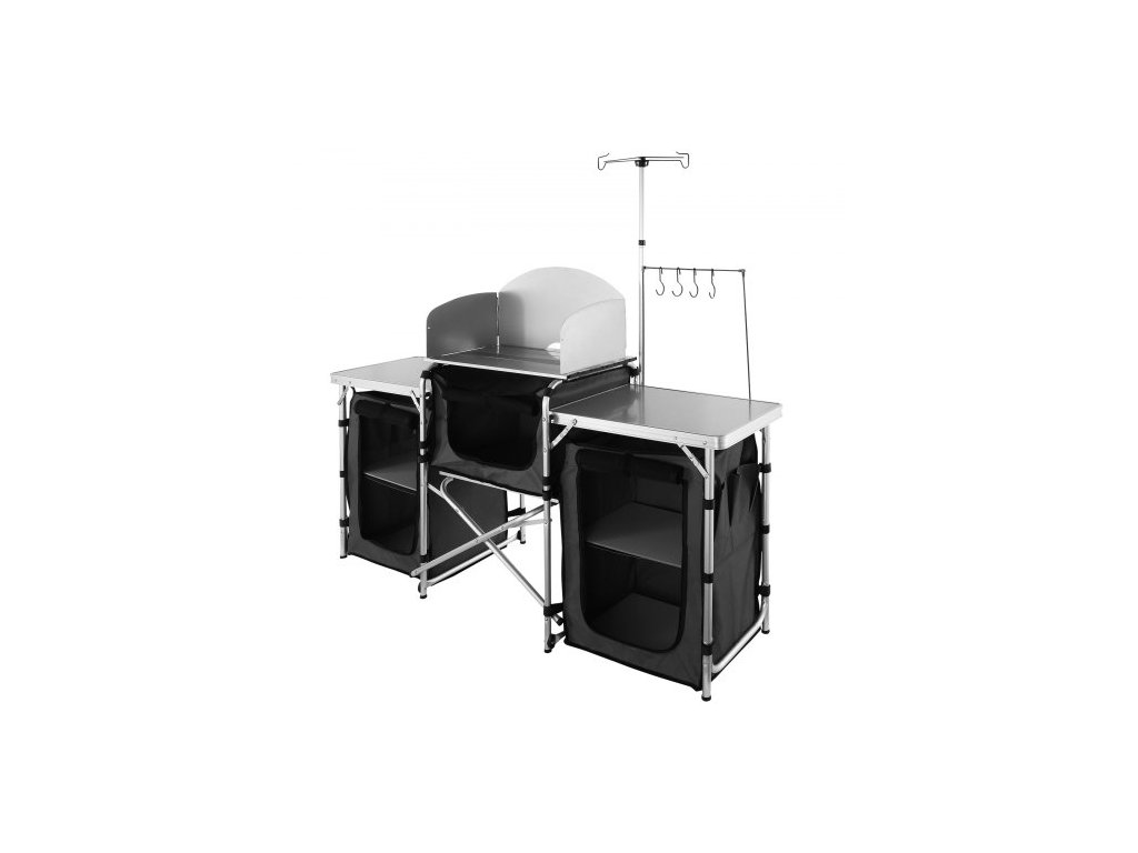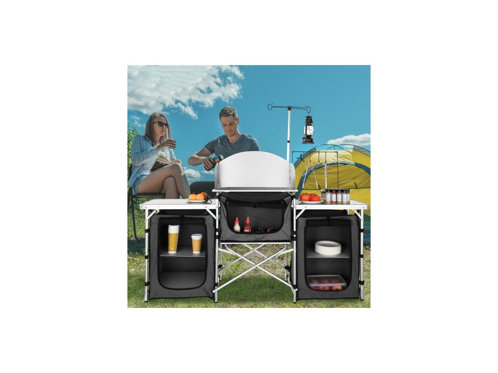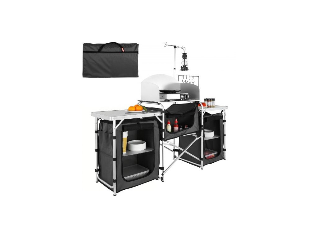 kempingový kuchyňský stůl, skládací venkovní kuchyňský stůl s úložným prostorem, přepravní taškou, hliníkovou kuchyňskou stanicí se 3 skříňkami a odnímatelným čelním sklem, rychlé nastavení pro pikniky, grilování, cestování v karavanu, černý