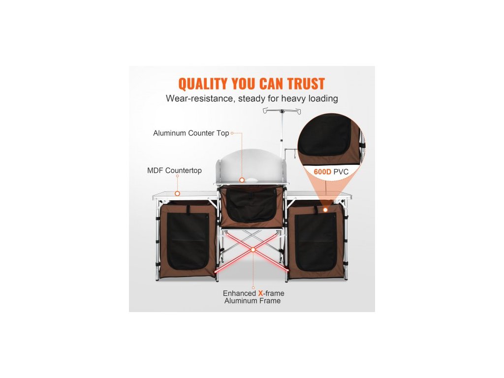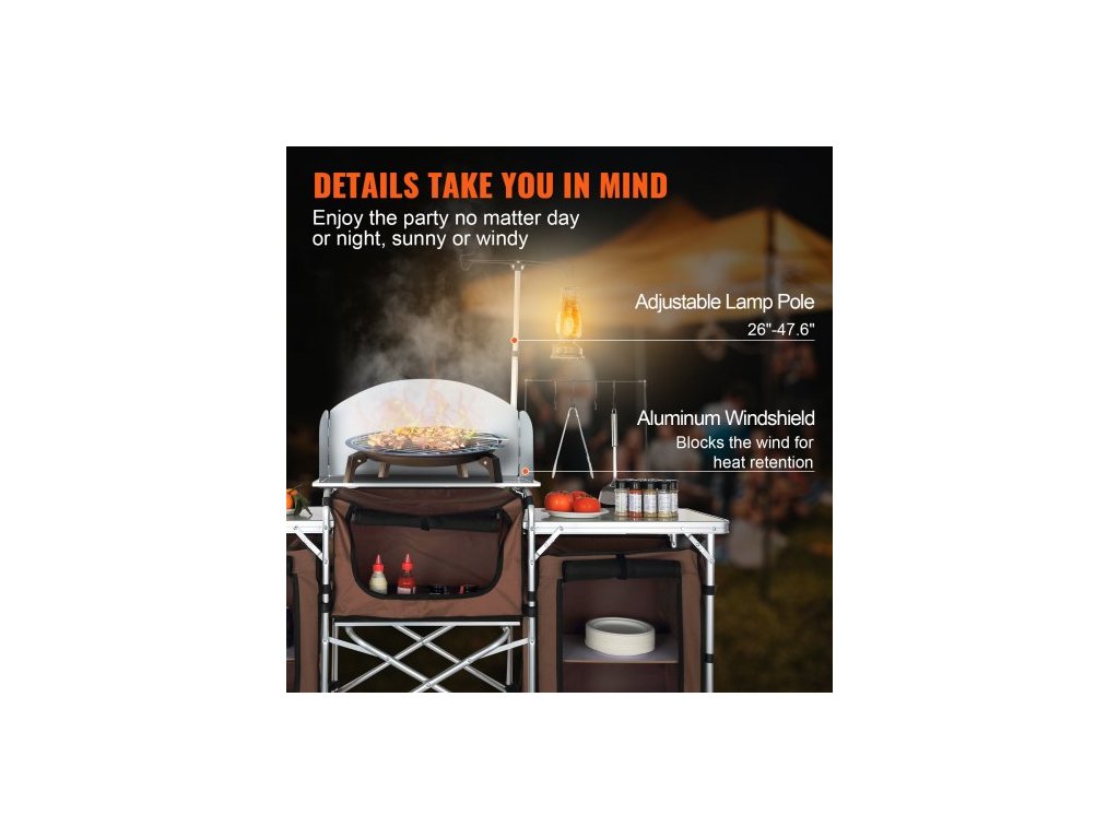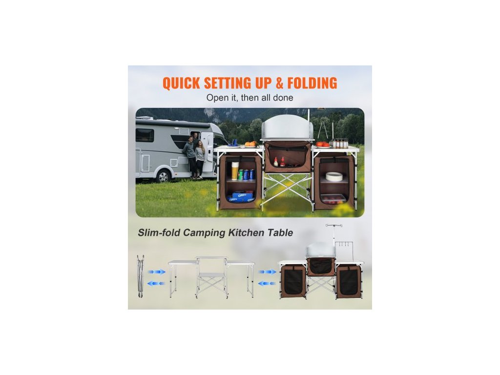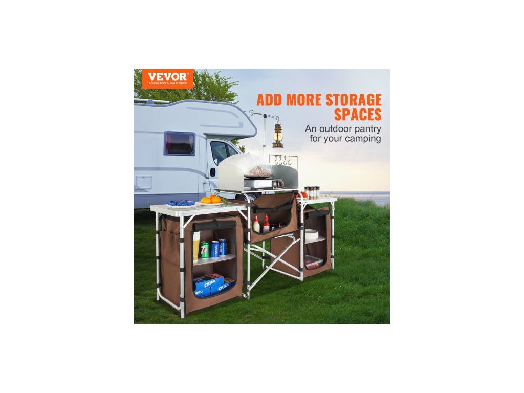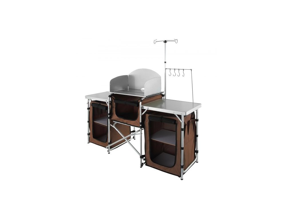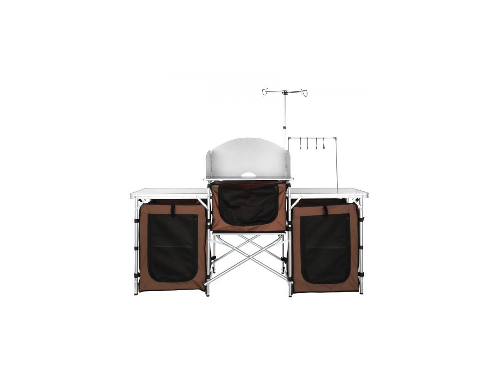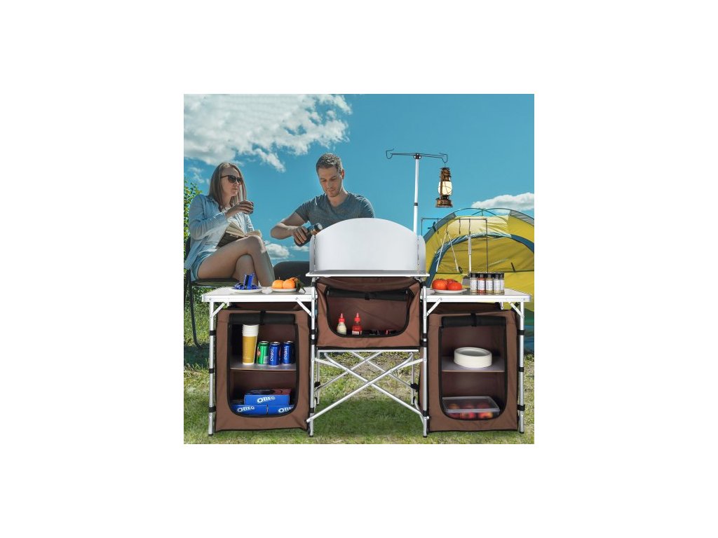kempingový kuchyňský stůl, skládací venkovní kuchyňský stůl s úložným prostorem, přepravní taškou, hliníkovou kuchyňskou stanicí se 3 skříňkami a odnímatelným čelním sklem, rychlé nastavení pro pikniky, grilování, cestování v karavanu, hnědý