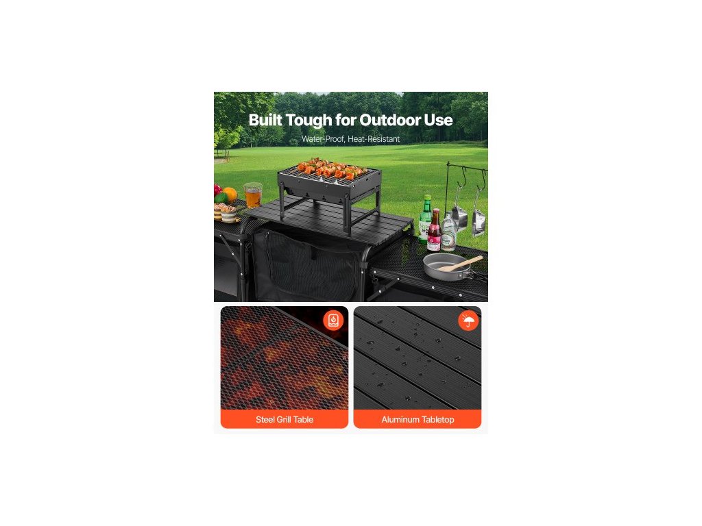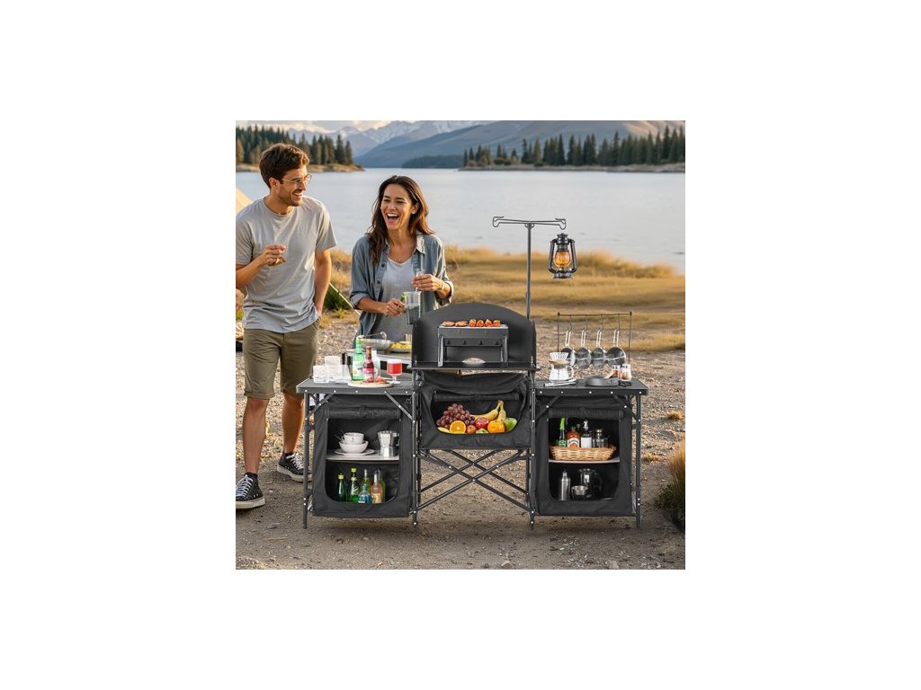 kempingový kuchyňský stůl, venkovní kempingový kuchyňský stůl, přenosná hliníková kuchyňská stanice se 3 úložnými skříněmi, přepravní taška, odnímatelný čelní štít, rychlé nastavení pro grilování, piknik, cestování v karavanu, černý
