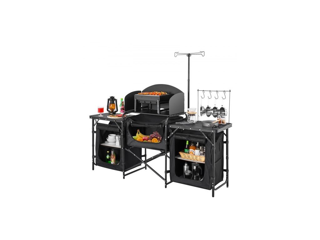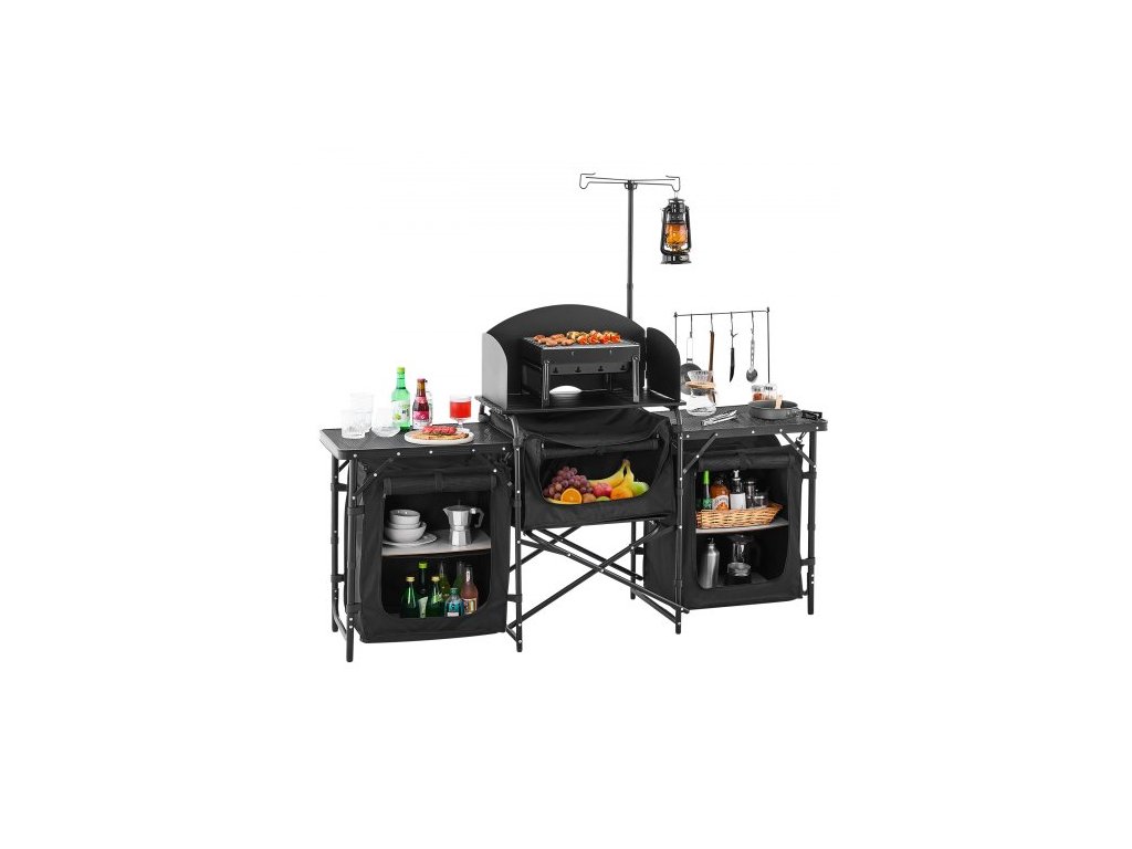 Camping Kitchen Table, venkovní kempingový kuchyňský stůl, přenosná hliníková kuchyňská stanice se 3 úložnými skříněmi, přepravní taška, odnímatelná čelní clona, rychlé nastavení pro grilování, piknik, cestování karavanem, černá