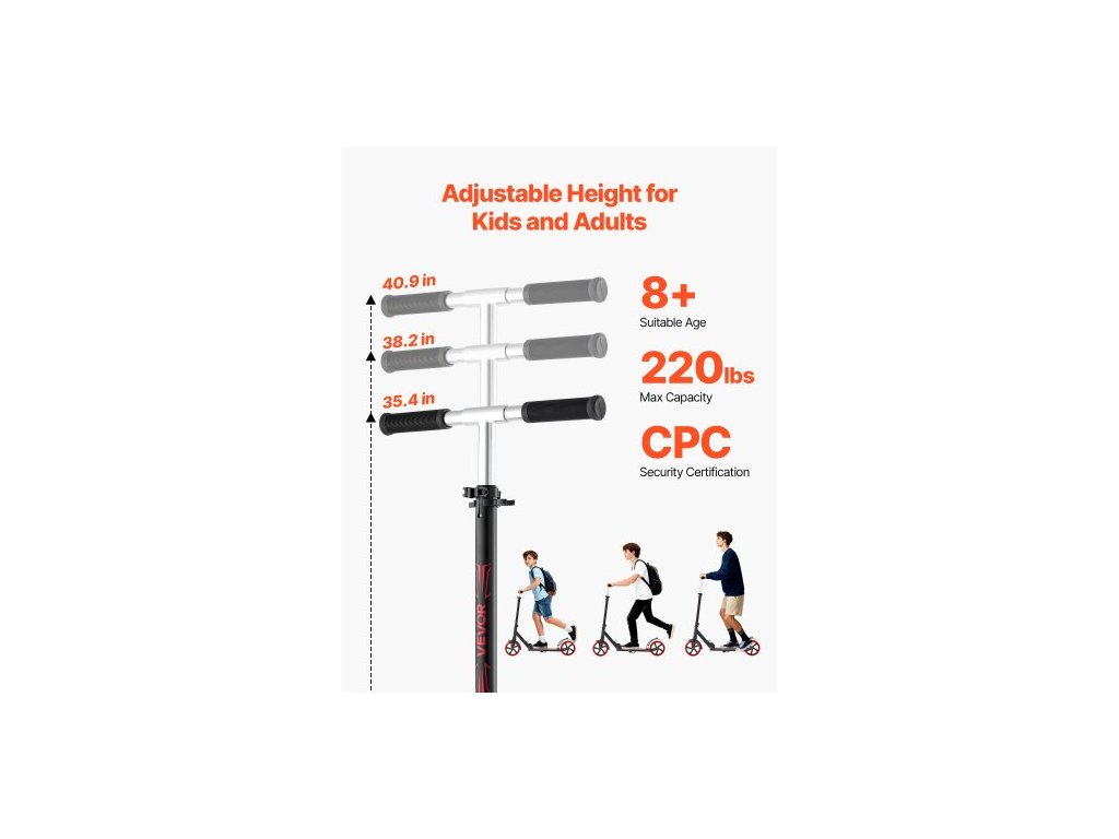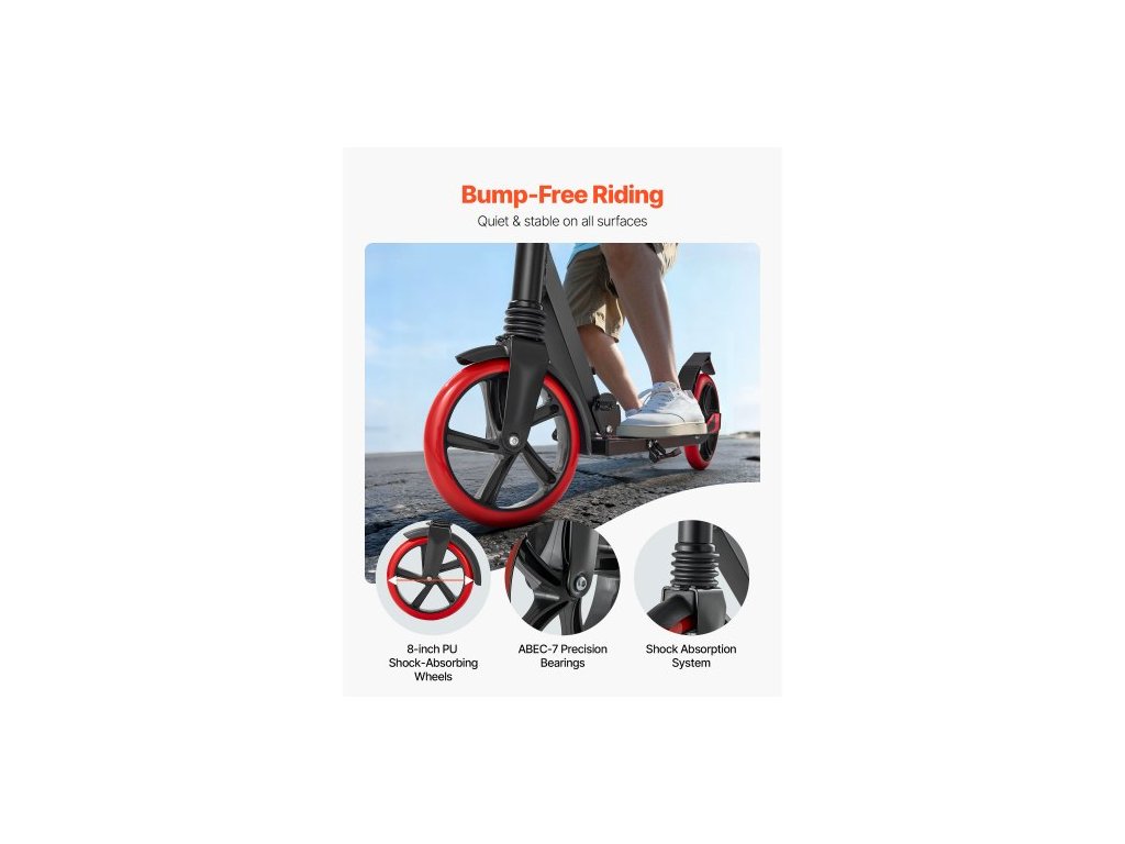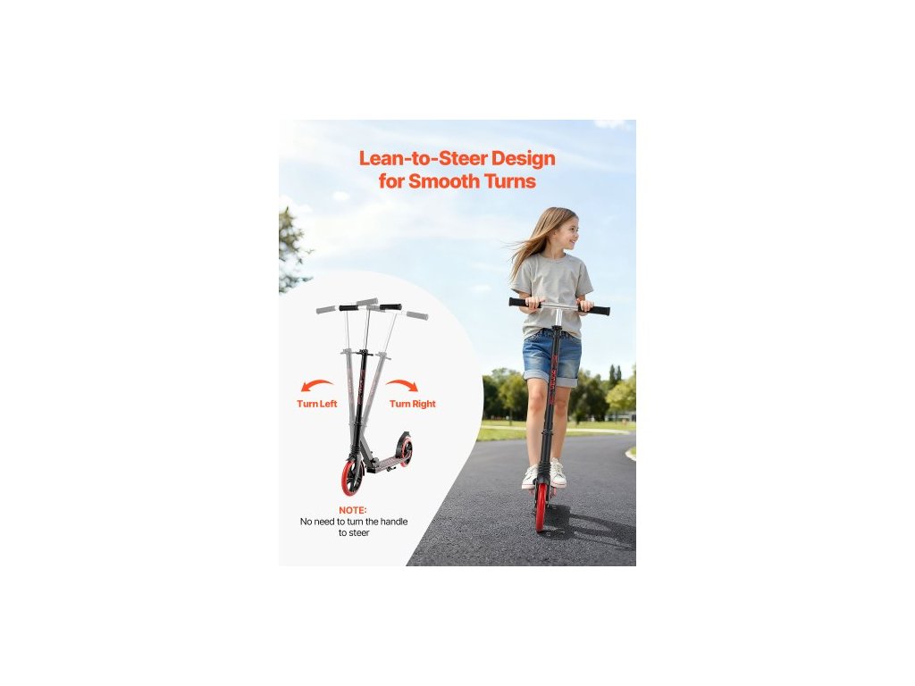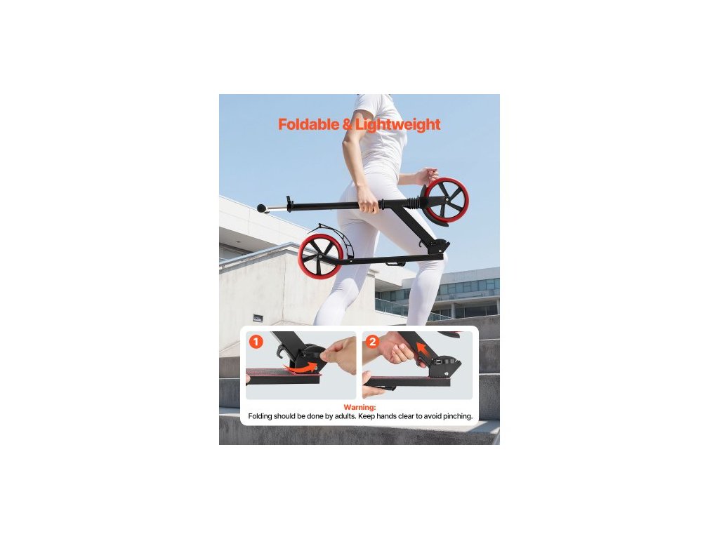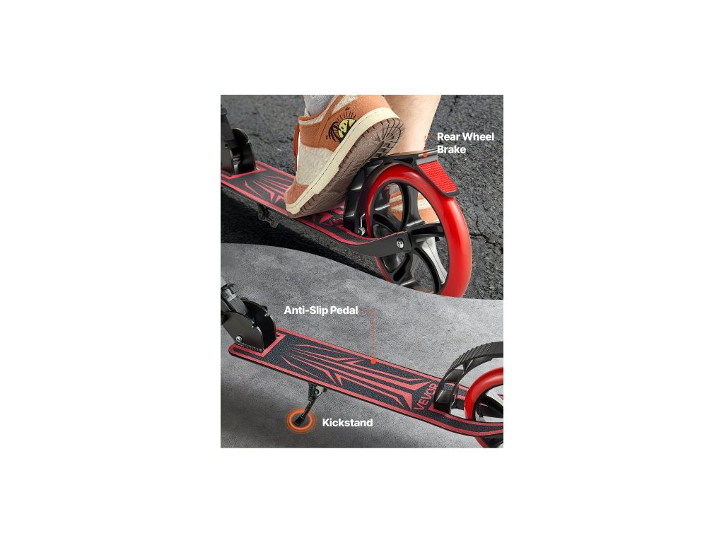 Koloběžka pro děti od 8 let, teenagery a dospělé, dvoukolová batolecí koloběžka s nastavitelnou výškou řídítek, široká protiskluzová deska, skládací a lehká pro chlapce a dívky do 99,8 kg, černá + červená