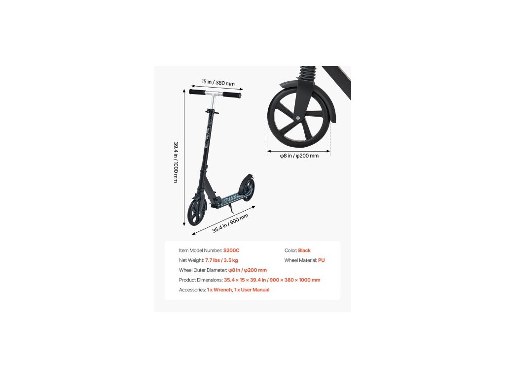 vnější průměr kol: ?8 palců/?200 mm, barva: černá, číslo modelu: S200C, rozměry výrobku: 35,4 x 15 x 39,4 palců/900 x 380 x 1000 mm, hmotnost netto: 7,7 lbs/3,5 kg, materiál kol: PU