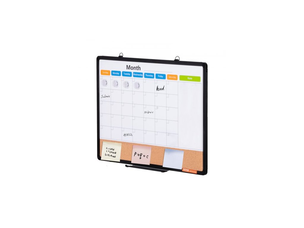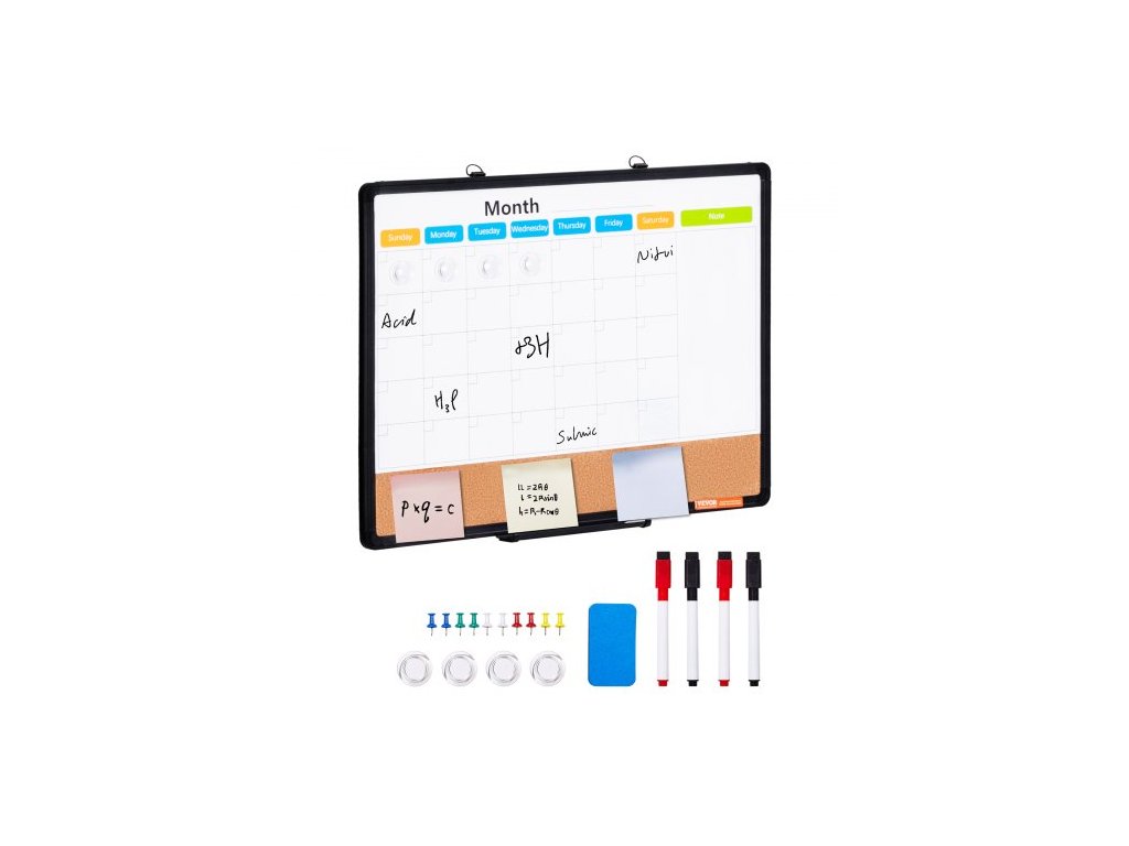 Kombinace bílé a korkové tabule s měsíčním kalendářem 24"x 18" s hliníkovým rámem – magnetická nástěnka 2 v 1 s možností suchého mazání k upevnění na zeď – ideální do školy, domů i kanceláře