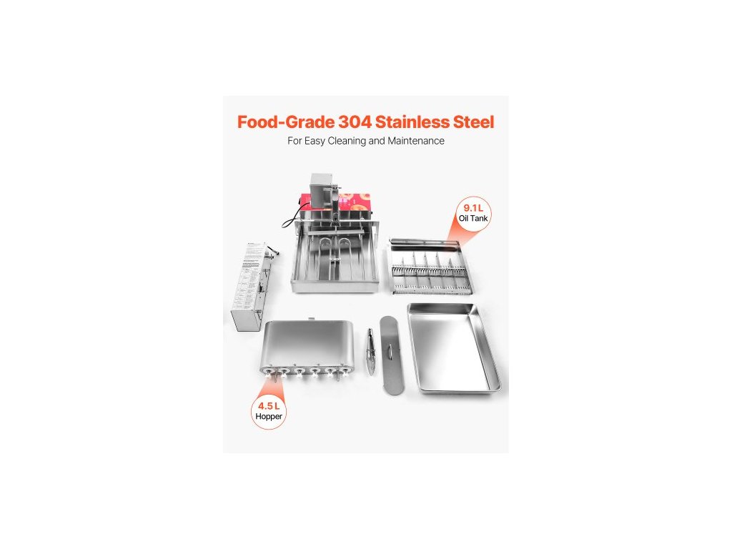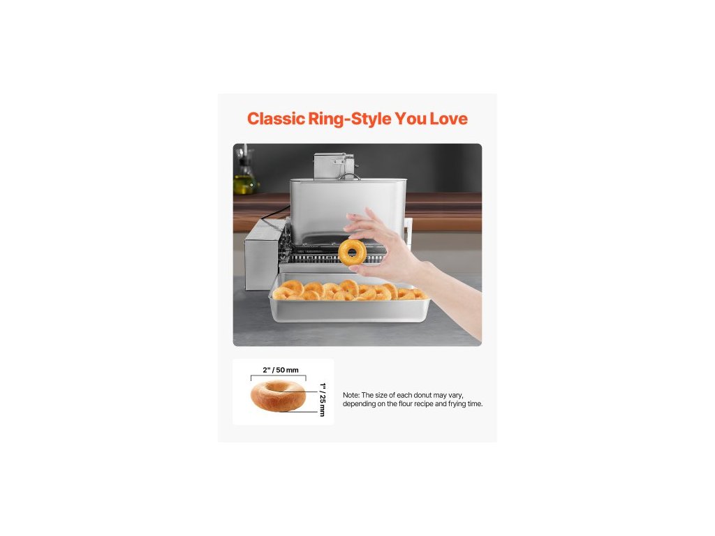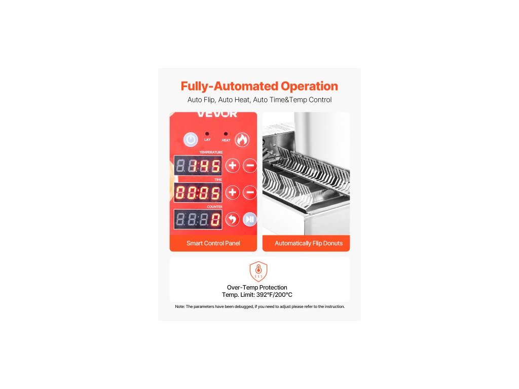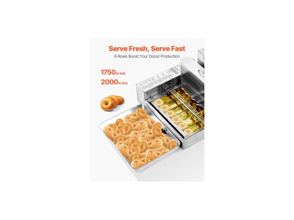 Objem násypky: 4,5 l, Vnější průměr koblihy: 1,2"-2,4" / 30-60 mm, Počet řad koblih: 6, Tloušťka koblihy: 0,6"-1,2" / 15-30 mm, Napětí: US: AC120V 60Hz, EU: AC220-240V 50Hz, Číslo modelu položky: US: ZDT-6, EU: ZDT-6-EU, Hmotnost výrobku: 41 lbs / 18,7 kg ± 3 %,Objem olejové nádrže: 9,1 l,Materiál: nerezová ocel 304,Výkon: US: 1750 W, EU: 2000 W