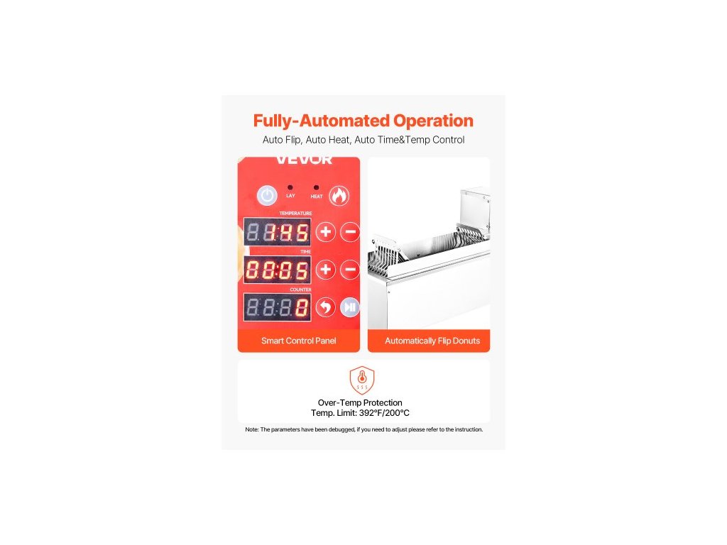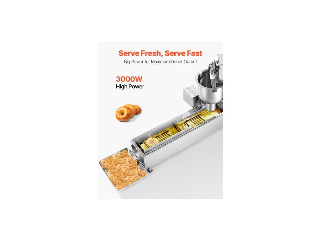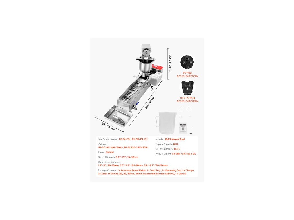 Objem násypky: 5,5 l, Tloušťka koblihy: 0,6"-1,2" / 15-30 mm, Napětí: US: AC120V 60Hz, EU: AC220-240V 50Hz, Vnější průměr koblihy: 1,2"-2" / 30-50 mm, 2,2"-3,5" / 55-90 mm, 2,8"-4,7" / 70-120 mm, Číslo modelu položky: US: DH-15L, EU: DH-15L-EU, Hmotnost výrobku: 24,7 kg ± 3 %, Objem olejové nádrže: 14,5 l, Materiál: Nerezová ocel 304, Výkon: 3000 W