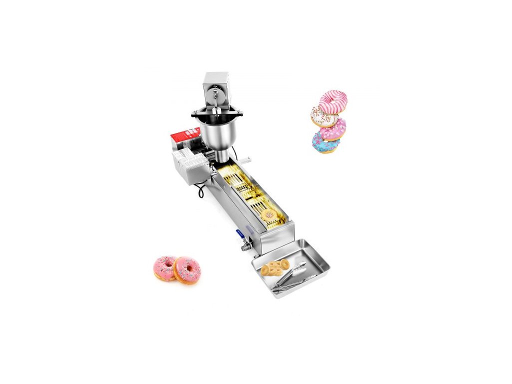 Komerční automatický stroj na koblihy, zařízení na výrobu jednořadých koblih, elektrický vysoce výkonný stroj na koblihy s výkonem 90 ks/hod, nerezová fritéza, s 3 velikostmi forem, automatické počítání