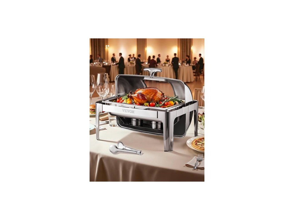 Kompletní sada ohřívacích talířů Roll Top Chafing Dish Buffet, 9 qt 1 balení, nerezová ocelová podnosná miska se 2 pánvemi poloviční velikosti, obdélníkový ohřívač na catering s viditelným víkem, pánev na vodu, skládací stojan, držák na palivo,