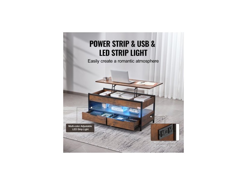 Konferenční stolek s výsuvnou deskou, obdélníkový konferenční stolek o šířce 99 cm s extra úložnými kapsami, výsuvný konferenční stolek s prodlužovacím kabelem, USB a ambientním osvětlením do obývacího pokoje, hnědý