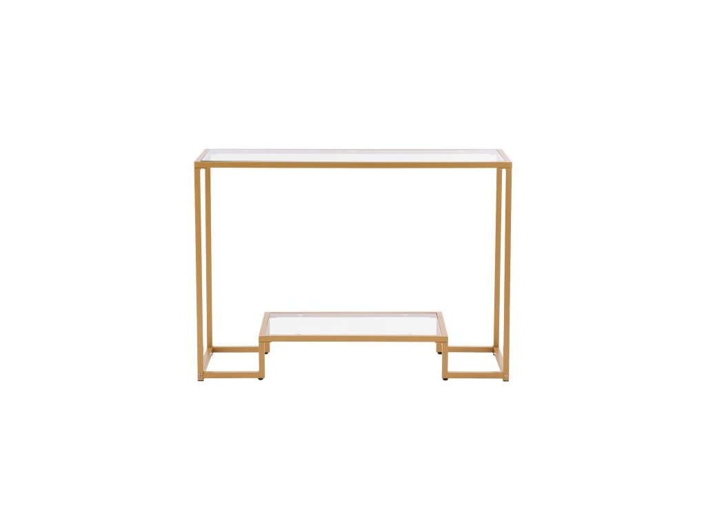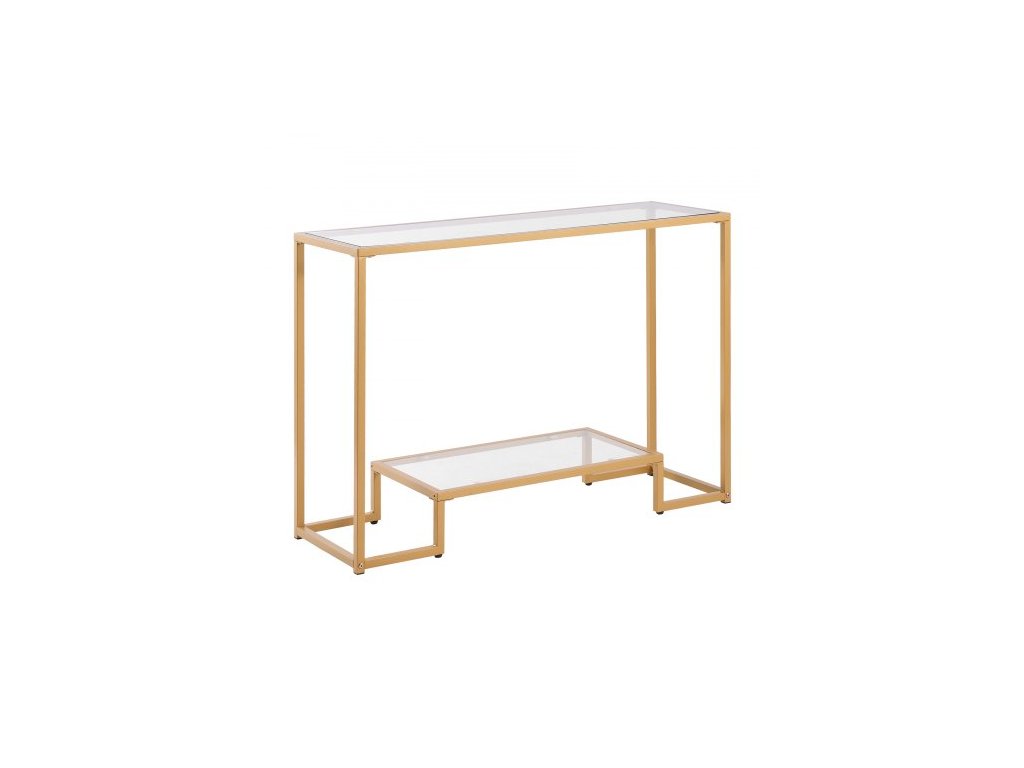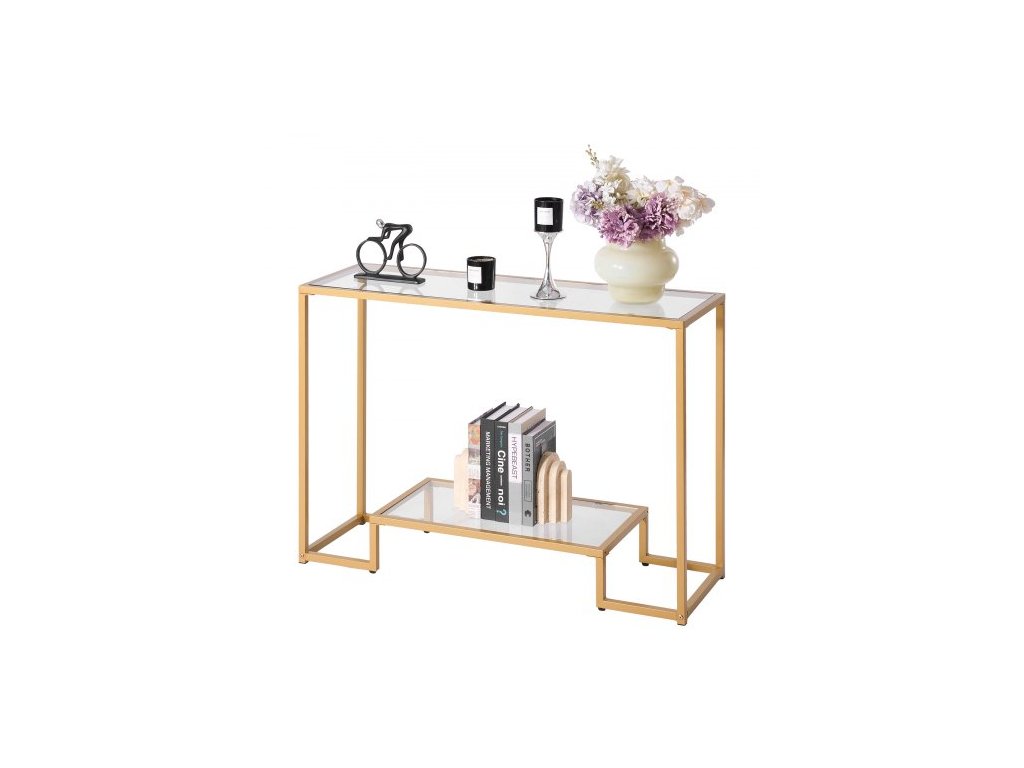 Konzolový stolek se 2 úrovněmi ze skla, moderní obdélníkový odkládací stolek k pohovce s deskou z tvrzeného skla a železnými nohami, zlatý konzolový stůl s ochranou proti převrácení do obývacího pokoje, chodby, vstupní haly, předsíně, zlatý