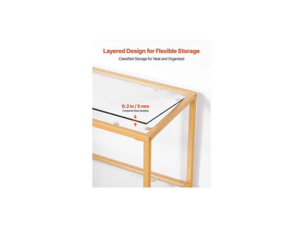 Konzolový stolek se 3 úrovněmi ze skla, moderní obdélníkový odkládací stolek k pohovce s deskou z tvrzeného skla a železnými nohami, zlatý konzolový stůl s pojistkou proti převrácení do obývacího pokoje, chodby, vstupní haly, předsíně, zlatý