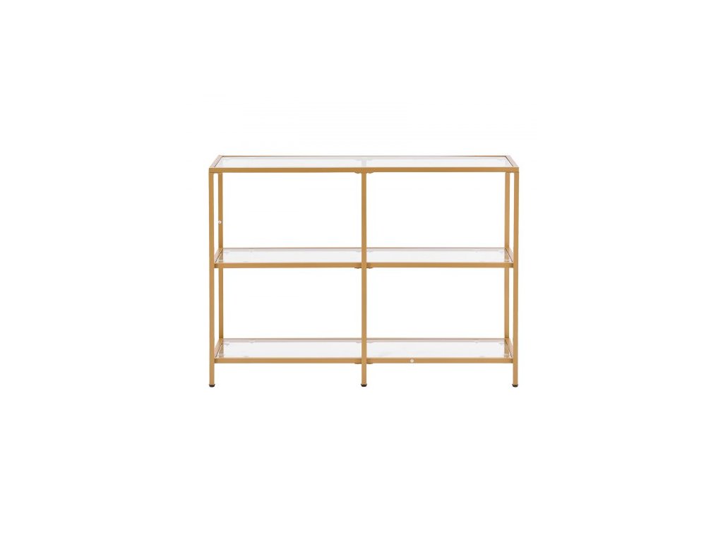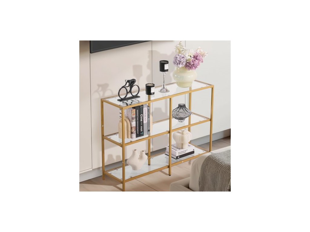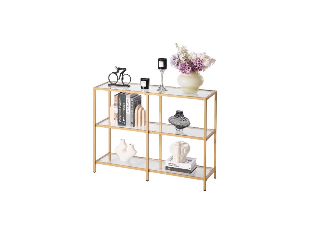 Konzolový stolek se 3 úrovněmi ze skla, moderní obdélníkový odkládací stolek k pohovce s deskou z tvrzeného skla a železnými nohami, zlatý konzolový stůl s ochranou proti převrácení do obývacího pokoje, chodby, vstupní haly, předsíně, zlatý