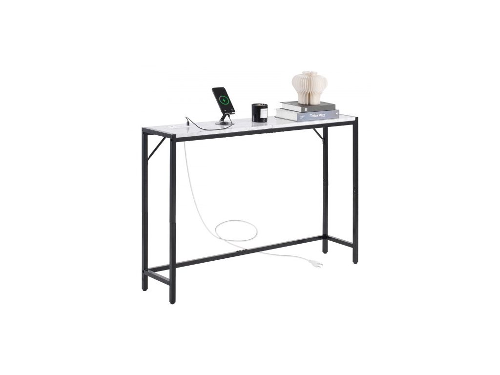 Konzolový stolek z mramoru, moderní úzký dlouhý konzolový stolek se zásuvkou, tenký odkládací stolek k pohovce s železnými trubkami, pojistkou proti převrácení a trojúhelníkovou oporou do obývacího pokoje, chodby, vstupní haly, předsíně
