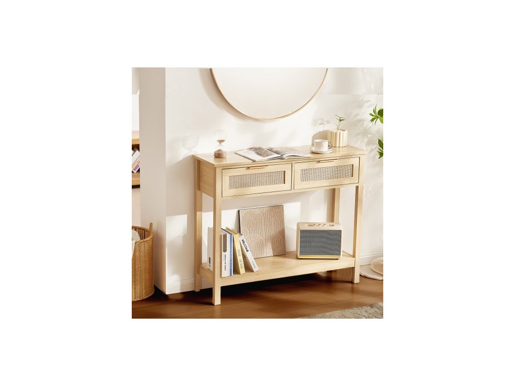 Konzolový stolek z ratanu se 2 úložnými zásuvkami, ratanový stolek do předsíně s posuvnými dveřmi z přírodního ratanu, konzolový stolek s rozkládací pohovkou do obývacího pokoje, pracovny, předsíně nebo televizní stěny, přírodní ratan, multifunkční design, dostatek úložného prostoru, stabilní a robustní, snadná montáž, všestranné použití, počet pater: 1, nosnost: 136 kg, číslo modelu: SR191632-1, hmotnost výrobku: 15,3 kg/33,73 lbs, zásuvky: 2, rozměry výrobku: 1000 × 300 × 745 mm (39,37 × 11,81 × 29,33 palce)
