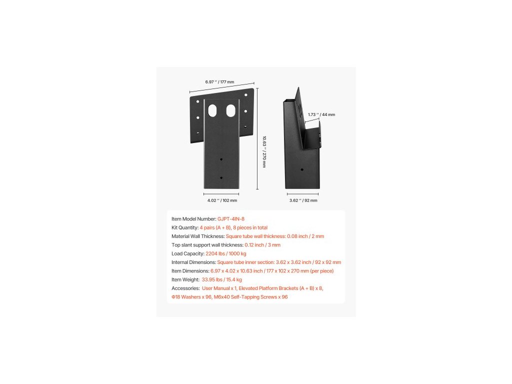 Množství v sadě: 4 páry (A + B), celkem 8 kusů,Nosnost: 2204 liber/1000 kg,Číslo modelu položky: GJPT-4IN-8,Tloušťka stěny materiálu: Tloušťka stěny čtvercové trubky: 0,12 palce / 3 mm; Tloušťka stěny horní šikmé podpěry: 0,08 palce / 2 mm,Rozměry položky: 6,97 x 4,02 x 10,63 palce / 177 x 102 x 270 mm (za kus),Vnitřní rozměry: Vnitřní průřez čtvercové trubky: 3,62 x 3,62 palce / 92 x 92 mm,Hmotnost položky: 33,95 lbs / 15,4 kg