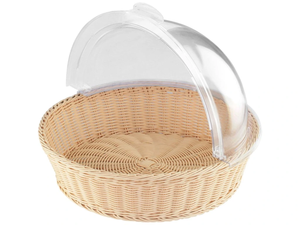 Koš s víkem Roll-Top na pečivo, O 39,5 cm, s katalogovým číslem 419202. Koš je vyroben z plastu, který svým vzhledem připomíná ratan a víko je vyrobeno z průhledného plastu. Snadno se čistí. Je vhodný do hotelů, restaurací, cateringových zařízení a dalších míst, kde se servíruje pečivo formou bufetu.