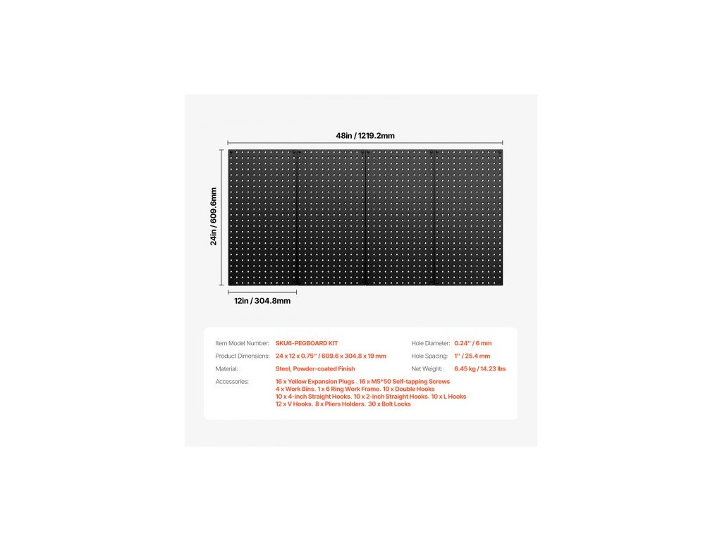 Číslo modelu položky: SKU6-PEGBOARD KIT,Rozteč otvorů: 1" / 25,4 mm,Materiál: Ocel, práškově lakovaná povrchová úprava,Průměr otvoru: 0,24" / 6 mm,Rozměry výrobku: 24 x 12 x 0,75" / 609,6 x 304,8 x 19 mm,Čistá hmotnost: 6,45 kg / 14,23 lbs