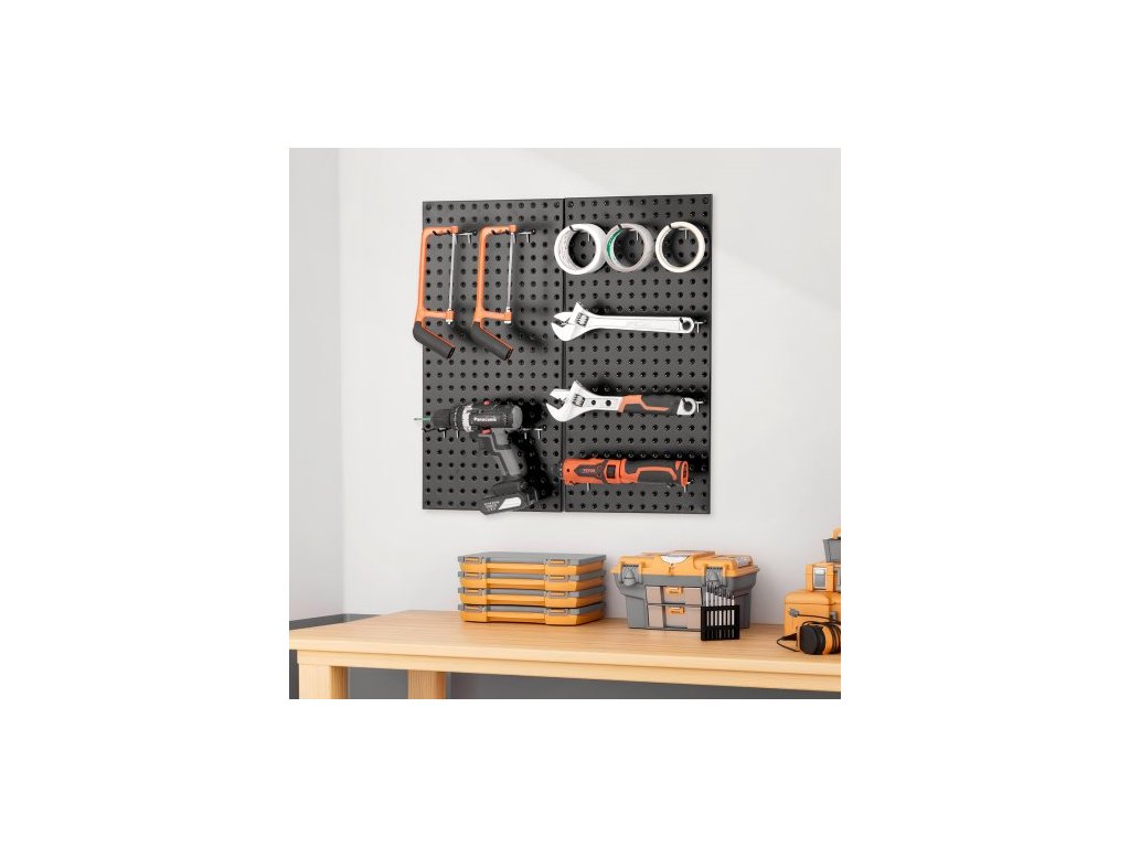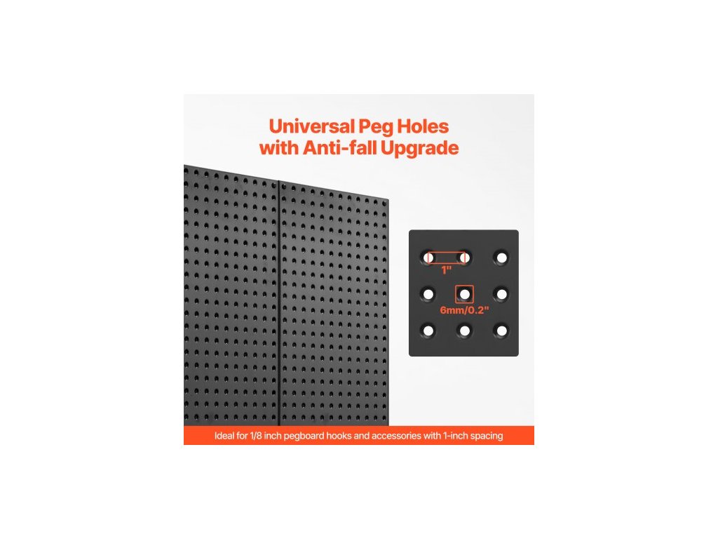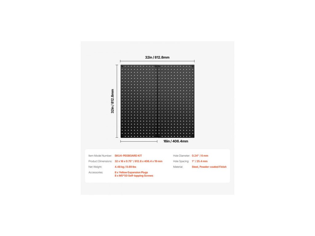 Číslo modelu položky: SKU4-PEGBOARD KIT,Rozteč otvorů: 1" / 25,4 mm,Materiál: Ocel, práškově lakovaná povrchová úprava,Průměr otvoru: 0,24" / 6 mm,Rozměry výrobku: 32 x 16 x 0,75" / 812,8 x 406,4 x 19 mm,Čistá hmotnost: 4,48 kg / 9,89 lbs