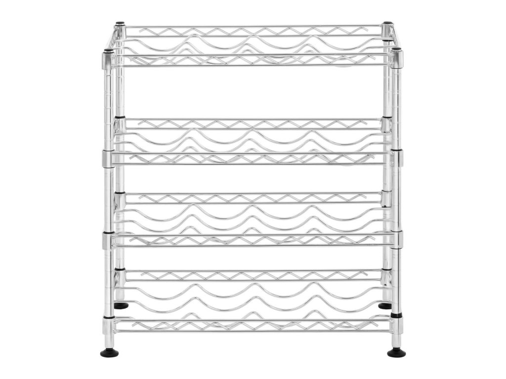 Stojan na víno kovový vyniká vysokou nosností a stabilitou. Stabilita tohoto zasouvacího regálu totiž není o nic menší než u běžných šroubových spojů, ale nosnost má dokonce vyšší. Rám se skládá ze čtyř tyčí o výšce 45 cm. Díky nastavitelným nožičkám stojí kovový regál na víno stabilně i na nerovných podlahách a neviklá se.