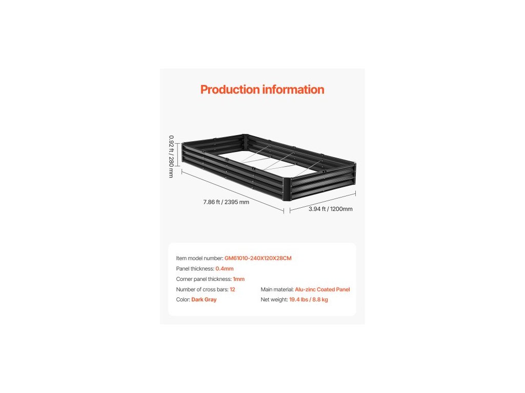 Tloušťka panelu: 0,4 mm, Barva: tmavě šedá, Číslo modelu položky: GM61010-240X120X28CM, Rozměry: 8 x 4 x 1 stopy / 2395 x 1200 x 280 mm, Čistá hmotnost: 19,4 lbs / 8,8 kg, Tloušťka rohového panelu: 1 mm, Počet příčných nosníků: 12, Hlavní materiál: Panel s hliníkovo-zinkovým povlakem
