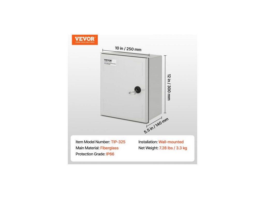 Vnější rozměry (V x Š x H): 11,8 x 9,8 x 5,5"/30 x 25 x 14 cm,Vnitřní rozměry (V x Š x H): 10,8 x 9,4 x 5,5"/27,5 x 24 x 14 cm,Montážní deska: Pozinkovaná zadní deska,Krytí IP: IP66,Materiál: SMC,Typ montáže: Nástěnná montáž,Čistá hmotnost: 7,72 lbs/3,5 kg,Použití: Vnitřní/venkovní, certifikace NEMA: NEMA typ 3, 3X