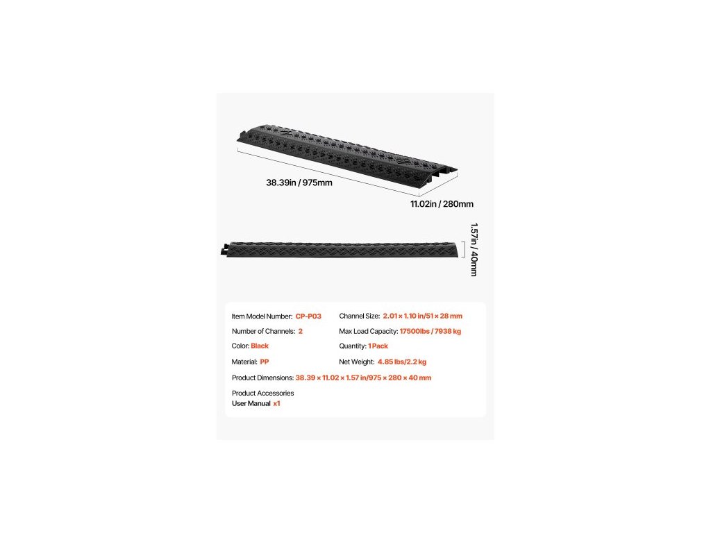 Rozměry kanálu: 51 x 28 mm,Počet kanálů: 2,Barva: Černá,Číslo modelu položky: CP-P03,Maximální nosnost: 7 938 kg (náprava),Množství: 1 balení,Materiál: PP
