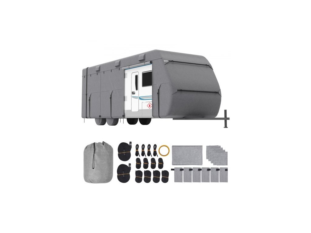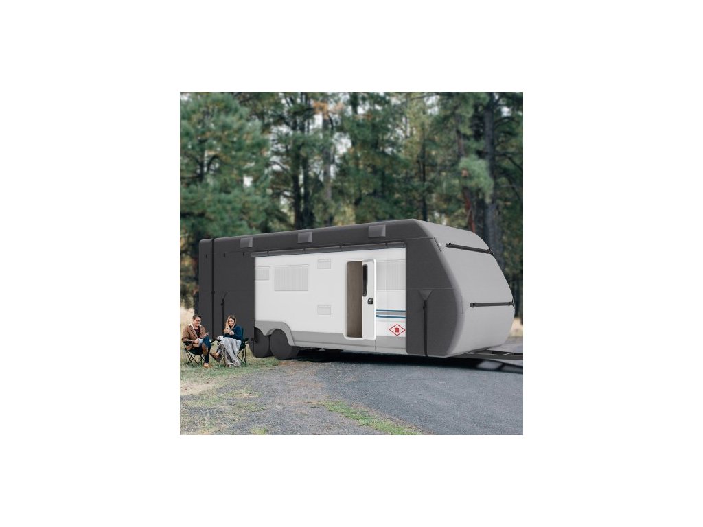 Kryt na cestovní přívěs , kryt na obytný přívěs o délce 6-7 m, čtyřvrstvý netkaný textilní kryt na obytný přívěs, vodotěsný, větruodolný a odolný proti roztržení třídy A, s úložným vakem, opravnými záplatami, popruhy a kryty pneumatik