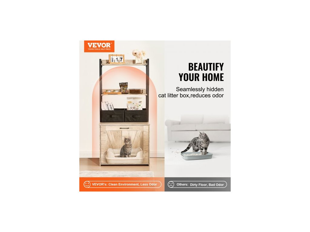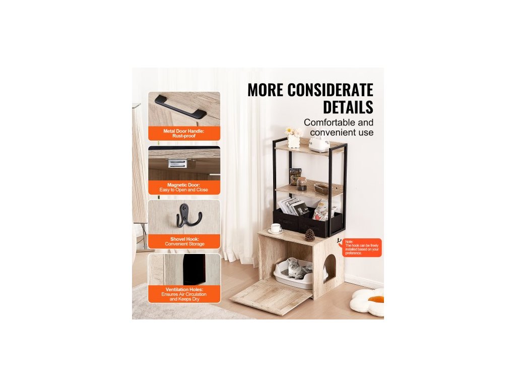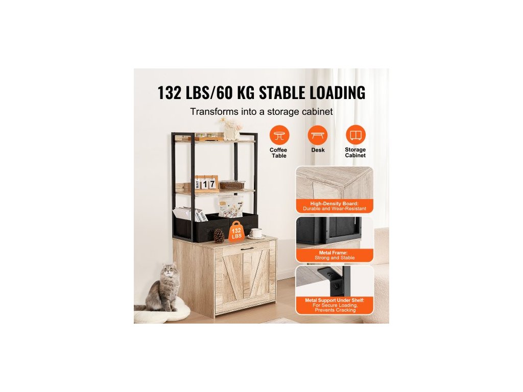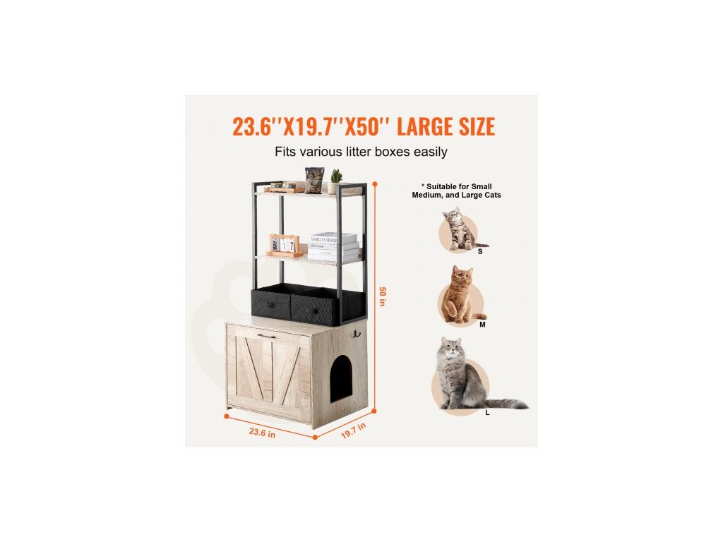 kryt na kočičí toaletu, skrytý nábytek na kočičí toaletu se 2 úložnými policemi a 2 košíky, dřevěná kočičí toaleta do interiéru, skříňka na kočičí toaletu se hodí do většiny kočičích toalet, 23,6"D x 19,7"Š x 50"V, přírodní